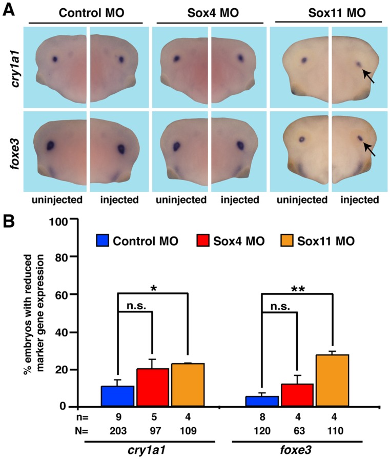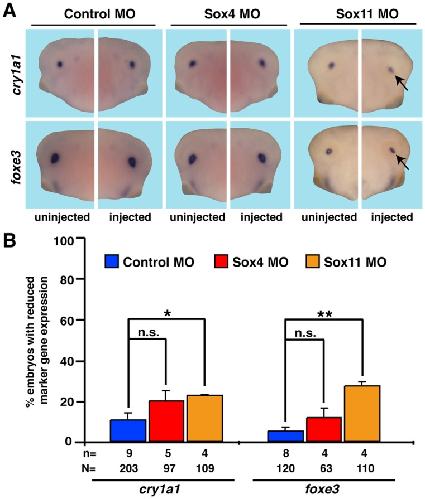 Figure 5. Lens development upon Sox4 or Sox11 depletion.Lens development was normal in Sox4 depleted embryos as shown by marker gene expression at stage 36. Loss of Sox11 resulted in a mild change of marker gene expression. nâ=ânumber of independent experiments, Nâ=ânumber of injected embryos analyzed, n.s.â=ânot significant, * Pâ¤0.05,** Pâ¤0.01. |