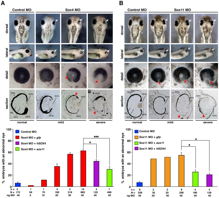 Figure 2. Sox4 or Sox11 loss of function results in an abnormal eye development.Effect of Sox4 (A) and Sox11 (B) depletion on eye development. The injection of Sox4 or Sox11 MO leads to smaller, deformed, and severely deformed eyes (white arrows) as illustrated in a dose dependent manner. A Control MO injection had no effect on eye development. Detailed views demonstrated defects in the formation of the RPE (red arrows). Vibratome sections showed that Control MO injection had no influence on the formation of the retinal layers and the RPE as well whereas depletion of Sox4 or Sox11 resulted in an abnormal RPE and retinal layering (red arrows). Quantitative representations are given. The eye phenotype of Sox4 or Sox11 down-regulation was significantly rescued by the co-injection of either SOX4 or sox11 RNA. GCLâ=âganglion cell layer, INLâ=âinner nuclear cell layer, nâ=ânumber of independent experiments, Nâ=ânumber of injected embryos analyzed, ONLâ=âouter nuclear cell layer, RPEâ=âretinal pigment epithelium. Error bars indicate standard error of the means (s.e.m.), * Pâ¤0.05, *** Pâ¤0.001. |