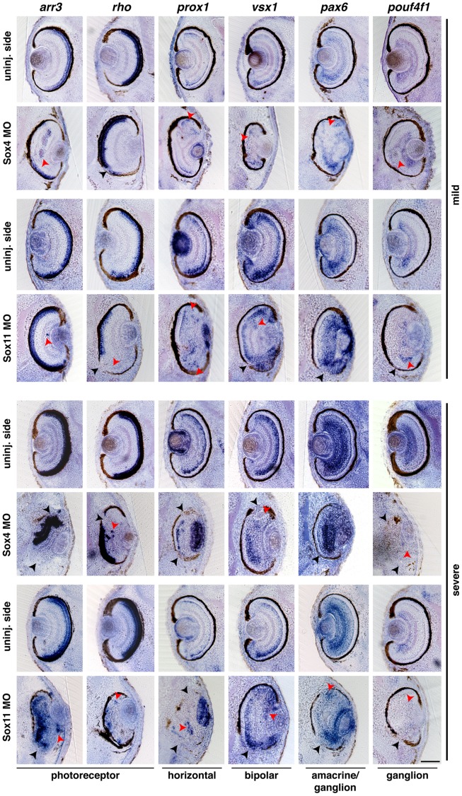 Figure 3. Sox4 depletion interferes with retinal lamination.Unilateral injection of 40 ng Sox4 or 40 ng Sox11 MO had no effect on the primary formation of most retinal cell types as shown by the expression of specific marker genes in mild eye phenotypes at stage 41. Only ganglion cells disappeared upon depletion of Sox4 or Sox11 in the severe eye phenotype. Many retinal cells were displaced (red arrowheads). Especially photoreceptor cells are displaced into inner layers of the retina (red arrowheads). In addition, the RPE is affected (black arrowheads). The uninjected (uninj.) sides revealed normal retinal lamination. For each marker gene, several embryos of different independent experiments were analyzed and showed a similar phenotype. Scale bar indicates 100 µm. |