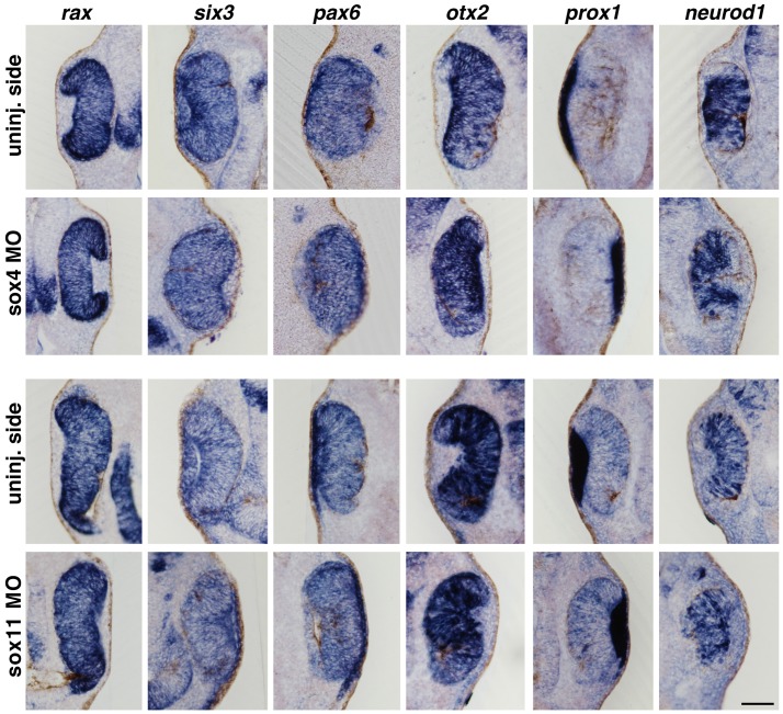 Figure 4. Proneural genes are not affected upon loss of Sox4 or Sox11.At stage 32, expression of proneural genes was not changed after loss of Sox4 or Sox11. Scale bar indicates 100 µm. |