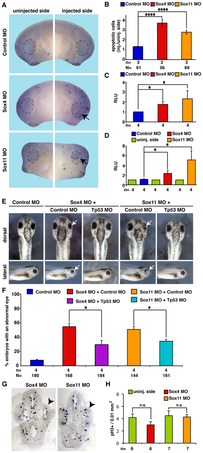 Figure 7. Loss of Sox4/11 function leads to cell apoptosis in the developing eye.A: TUNEL staining of Sox4 or Sox11 depleted embryos at stage 32. The areas where apoptotic cells have been counted are highlighted by a dotted circles and increased cell apoptosis was labeled by arrows. B: Quantitative representation of the TUNEL staining shown in A. nâ=ânumber of independent experiments. **** Pâ¤0.0001. C: Increased caspase 3/7 activity after loss of Sox4 or Sox11 at stage 32. Values represent relative light units (RLU) normalized to Control MO injected embryos. nâ=ânumber of independent experiments. Error bars indicate standard error of the means (s.e.m.). D: Unilateral injection of 40 ng Sox4 or Sox11 MO led to increased caspases 3/7 activity while uninjected sides or Control MO injected embryos were not affected. Values represent relative light units (RLU) normalized to the uninjected side. nâ=ânumber of independent experiments. Error bars indicate standard error of the means (s.e.m.). E: Increased cell apoptosis upon loss of Sox4 and Sox11 was rescued by tp53 inhibition. F: A quantitative representation of the results in E is given. nâ=ânumber of independent experiments, Nâ=ânumber of injected embryos analyzed. G: Crosssections of Sox4 or Sox11-depleted embryos demonstrating mitotic cells (blue, pH3 staining). Black arrowheads point to the MO injected side. H: A quantitative representation of the data in F is given. Sox4 or Sox11 depletion had not significant (n.s.) effect on cell proliferation in the eye at stage 32. nâ=ânumber of independent experiments. Error bars indicate standard error of the means (s.e.m.), n.s. not significant, * Pâ¤0.05, **** Pâ¤0.0001. |