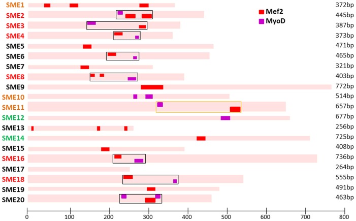 Figure 4. TFBS analysis.Top 20 predicted SMEs were examined for the presence of Mef2 and MyoD clusters. We found clusters of >2 Mef2/MyoD sites over regions >200 bp in all 6 SMEs shown to drive muscle expression in combination with γ-cry promoter (red) and 1/3 of the additional 3 enhancers that were found to drive muscle expression in combination with krt8 promoter only (orange). Two of the negative elements also displayed this cluster (SME6/SME20), but none of the enhancers found to express in tissues other than muscle (green).