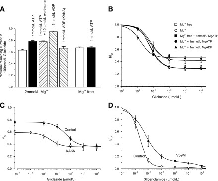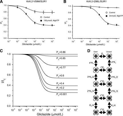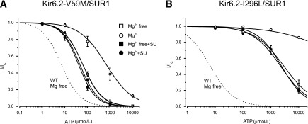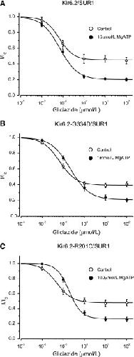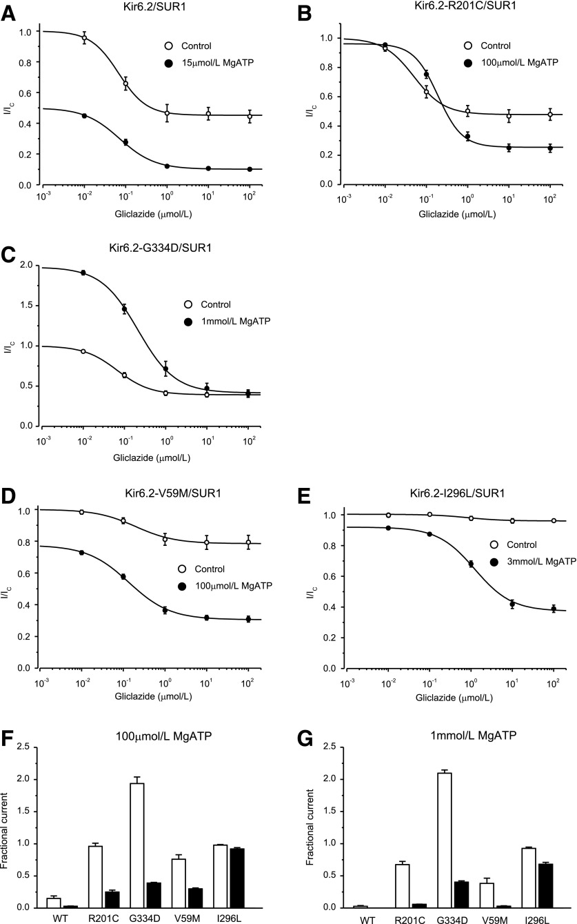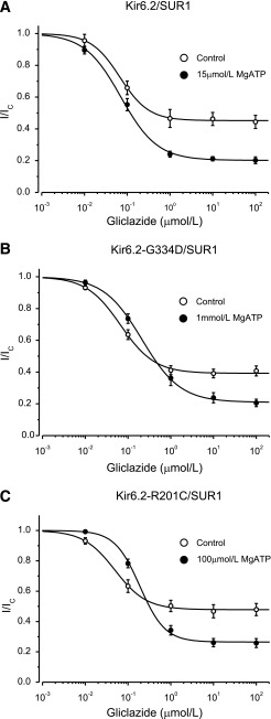 Sulphonylurea drugs are the therapy of choice for treating neonatal diabetes (ND) caused by mutations in the ATP-sensitive K(+) channel (KATP channel). We investigated the interactions between MgATP, MgADP, and the sulphonylurea gliclazide with KATP channels expressed in Xenopus oocytes. In the absence of MgATP, gliclazide block was similar for wild-type channels and those carrying the Kir6.2 ND mutations R210C, G334D, I296L, and V59M. Gliclazide abolished the stimulatory effect of MgATP on all channels. Conversely, high MgATP concentrations reduced the gliclazide concentration, producing a half-maximal block of G334D and R201C channels and suggesting a mutual antagonism between nucleotide and gliclazide binding. The maximal extent of high-affinity gliclazide block of wild-type channels was increased by MgATP, but this effect was smaller for ND channels; channels that were least sensitive to ATP inhibition showed the smallest increase in sulphonylurea block. Consequently, G334D and I296L channels were not fully blocked, even at physiological MgATP concentrations (1 mmol/L). Glibenclamide block was also reduced in β-cells expressing Kir6.2-V59M channels. These data help to explain why patients with some mutations (e.g., G334D, I296L) are insensitive to sulphonylurea therapy, why higher drug concentrations are needed to treat ND than type 2 diabetes, and why patients with severe ND mutations are less prone to drug-induced hypoglycemia.