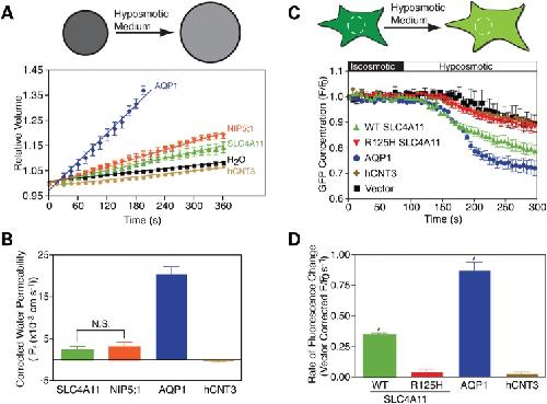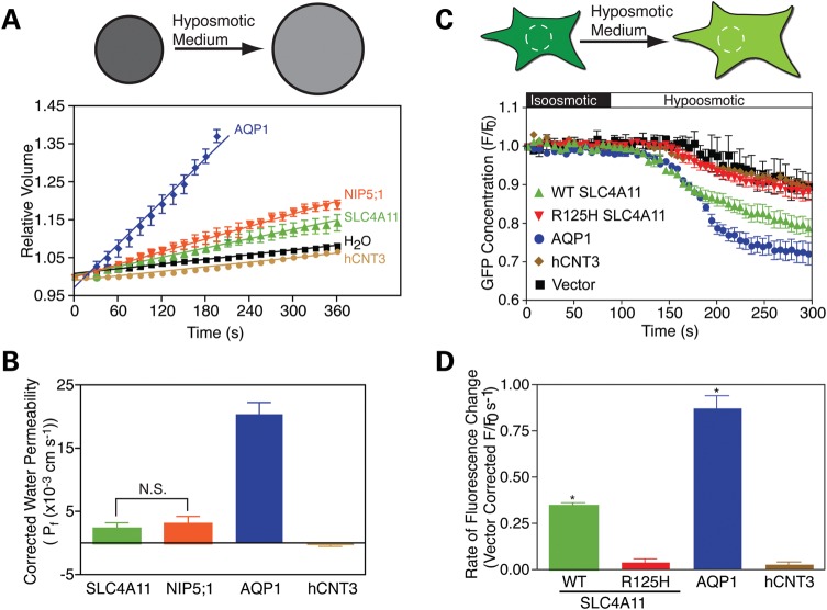 Figure 2. Water-flux through SLC4A11. (A) Xenopus oocytes were injected with H2O or H2O containing RNA transcripts encoding N-terminally HA-tagged SLC4A11, AQP1, NIP5;1 or untagged hCNT3. Osmotic swelling was induced by perfusing the oocytes with 44 mOsm/kg hypotonic solution at time zero, and oocyte volume was calculated from images captured digitally every 15 s. Top of panel diagrammatically shows a spherical oocyte swelling in response to hypo-osmotic medium. (B) Osmotic water permeabilities (Pf) were calculated (23) for oocytes and corrected for the value observed in H2O-injected oocytes (2.9 ± 0.09 à 10â3 cm sâ1). Bars represent mean ± SE from three separate swelling assays with 10 oocytes per assay. N.S., not significant. (C) HEK293 cells were transiently co-transfected with eGFP cDNA and SLC4A11 (WT and R125H mutant), hCNT3, AQP1 cDNAs or empty vector. Cells were perfused alternately with isotonic (black bar) and hypotonic (white bar) medium. eGFP fluorescence in regions of interest was measured digitally from images captured every 250 ms, but here only one data point every 3 s is shown. Top of panel diagrammatically represents a eGFP-expressing cell swelling in response to hypotonic medium. White circle represents the region of interest monitored to measure the change of eGFP concentration. (D) Rate of fluorescence change, calculated by linear regression of the initial intensity change during the first 15 s of perfusion with hypotonic buffer, was corrected for activity of vector-transfected cells (0.19 ± 0.005 sâ1). Data represent the mean ± SE of six independent swelling experiments with 30â40 cells measured per assay. *Significant difference (P < 0.01) compared with hCNT3. |