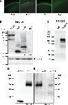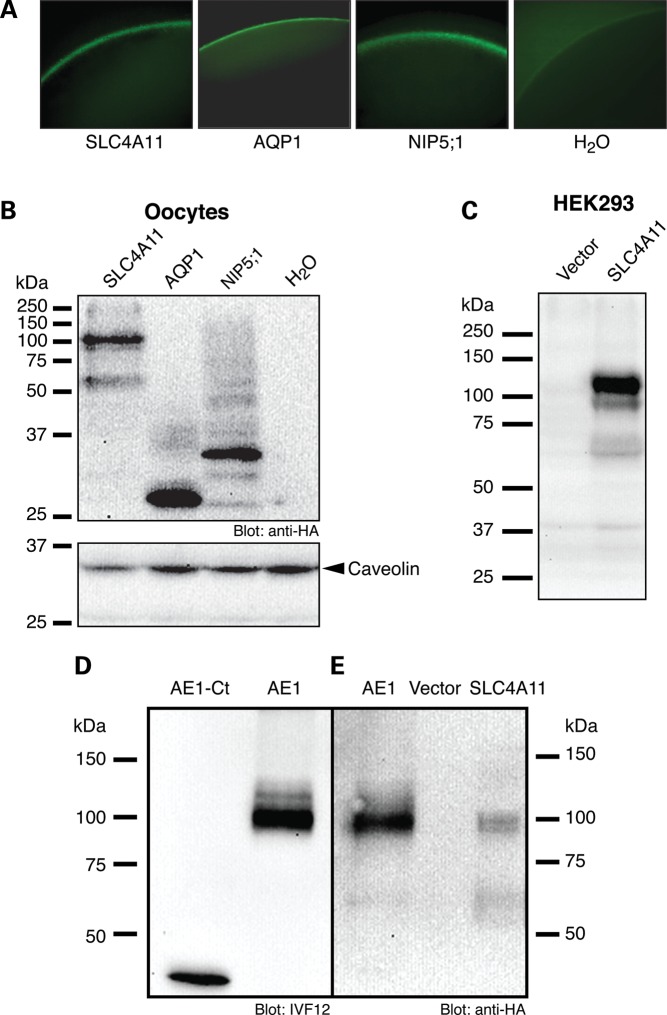 Figure 1. Quantification of SLC4A11 expression. (A) Confocal immunofluorescence of oocytes injected with the indicated RNA transcripts. HA-tagged proteins were detected using mouse anti-HA antibody and visualized using chicken anti-mouse IgG conjugated with Alexa Fluor 488 (green). (B) Oocytes, injected with cRNA encoding HA-epitope tagged SLC4A11, AQP1, NIP5;1 or with water alone were fractionated to produce a membrane-rich extract. Samples corresponding to 10 oocytes were probed on immunoblots with anti-HA antibody and caveolin antibody as a marker of the amount of membrane protein present, to enable measurement of the amount of HA-tagged protein/oocyte. (C) HEK293 cells were transfected with SLC4A11 cDNA or with vector alone were probed on immunoblots with a polyclonal antibody generated in rabbit against a synthetic peptide corresponding to amino acids 37â50 of human SLC4A11, in the putative cytoplasmic N-terminal domain of the protein. (D) AE1-Ct (40 ng protein) and 50 µg of protein from HEK293 cells transfected to express HA-epitope-tagged human AE1 (25) were immunoblotted and probed with mouse monoclonal anti-AE1 antibody, IVF12 (46). Densitometry of the immunoblot revealed the relative amounts of AE1 antigen present in the two preparations. (E) HEK293 cell lysate, containing 60 ng AE1, was electrophoresed along with a lysate of X. laevis oocyte membranes, corresponding to 10 oocytes. Densitometry revealed that each oocyte therefore contains 15 ng SLC4A11, corresponding to 9.1 à 109 SLC4A11/oocyte. |