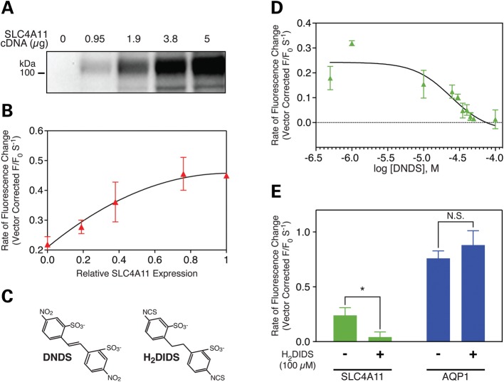 Figure 4. Water-flux is proportional to SLC4A11 expression level and is inhibited by stilbene disulfonates. (A and B) HEK293 cells were co-transfected with eGFP cDNA and indicated amount of cDNA encoding HA-tagged wild-type (WT) SLC4A11. (A) SLC4A11 expression was quantified on immunoblots of cell lysates probed with anti-HA antibody. (B) Cell swelling of HEK293 cells, expressing various amounts of SLC4A11, was assessed by the eGFP dilution assay (as in Fig. 2C). The rate of swelling observed for vector-alone transfected cells was subtracted from the values observed for cells expressing SLC4A11. (C) Chemical structures of SLC4A11 inhibitors used here. (D and E) HEK293 cells were co-transfected with eGFP and either SLC4A11, AQP1 or vector cDNA. Water-flux following shift to hypo-osmotic medium, assessed by measuring the rate of eGFP fluorescence change (as in Fig. 2C), was corrected for rate in vector-transfected cells. (D) Water-flux assays were performed in the presence of varied concentrations of DNDS, a non-covalently acting compound classically used to inhibit proteins of the SLC4 family (48). Half-maximal effective concentration determined from the curve is 24 ± 1 µM DNDS, n = 3. (E) eGFP dilution water-flux assays were performed in the absence or presence of 100 µM H2DIDS, a covalently acting stilbene disulfonate. Rates of fluorescence change were corrected for the value found for vector-transfected cells. *P < 0.05. N.S., not significant. n = 3. |