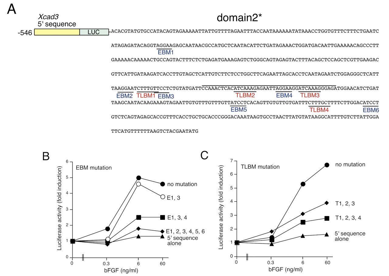 Fig. 4. EBMs and TLBMs as sub-elements of FREs. (A) Nucleotide sequence of the domain 2* region of Xcad3 intron 1. EBMs and TLBMs are marked and numbered. (B,C) Mutational analysis of EBMs (B) and TLBMs (C). Reporter constructs examined contain the domain 2* fragments that carry various combinations of mutations in EBMs or TLBMs, as indicated to the right of each graph (E1, 3 means that EBM1 and EBM3 are mutated). Mutations were introduced as follows: GAA to agA in E1, 2 and 4; TCC to ctC in E3 and 5; ATCCT to gTCga in E6; TTTGT to Tcgag in T1; TCAAA to TagAc in T2; TCAAAGG to Tgtcgac in T3; CTTTG to gaaTt in T4. Reporter activities of mutated constructs were analyzed as in Fig. 3, except that ectoderm cells were cultured in the absence or presence of increasing concentrations of bFgf. |