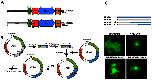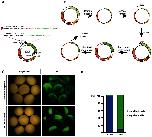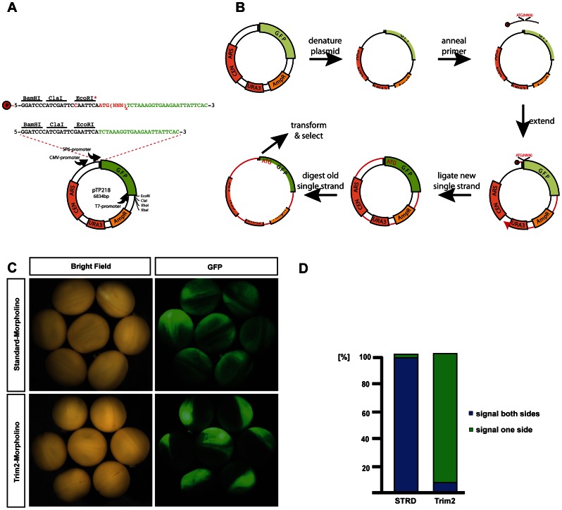 Figure 2. Standard primer for SOMA-construction of a GFP reporter (A).Phosphorylated primer (red P) with diagnostic EcoRI site (red C; EcoRI*), 23 bp of GFP (green sequence) and morpholino target sequence in frame with GFP (NNN)x including ATG (red sequence). Green fluorescent protein (GFP) gene (green); ampicillin resistance gene (AmpR; yellow); URA3 gene, yeast centromere (CEN), autonomous replication sequence (ARS) (red). Schematic outline of the SOMA method for production of GFP reporters (B). (1) denature pTP218; (2) 5′ phosphorylated single primer anneals; (3) primer is extended to the 5′ end; (4) nicks are ligated; (5) template strand is digested with DpnI; (6) mutated single stranded plasmid transformed into E. coli and positive clones identified by lack of EcoRI site. Test of TRIM2 GFP reporter construct in vivo (C). Synthetic reporter sense RNA injected into fertilized Xenopus laevis embryos at the one-cell stage; TRIM2- or Standard (STRD)-morpholino injected into one blastomere at the two-cell stage. Visualization after 1 day by brightfield or fluorescence microscopy (GFP). 99 of total 101 standard morpholino (STRD) injected embryos showed a GFP signal on both sides (98%); 249 of total 271 Trim2- morpholino injected embryos showed a GFP signal on one side (92%) (right).