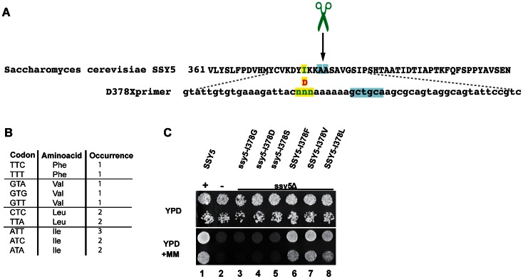 Figure 4. Generation of a semi-random mutagenized gene library using SOMA.(A) Ssy5 sequence with autolytic processing site (scissors) between A381 and A382 (blue). Replacement of conserved isoleucine378 (I; green) with aspartate (D; red) inactivates Ssy5. Primer D378X with random codon (NNN) theoretically capable of encoding all amino acids at position 378 (green). (B) Table with active D378 substitutions recovered in plasmids selected based on their ability to confer Ssy5-dependent growth on YPD+MM. (C) Dilutions of strain HKY77 (ssy5Δ) carrying pSH120 (SSY5; +), pRS316 (empty plasmid; -), I378G, I378D, I378S, I378F, I378V, or I378L.