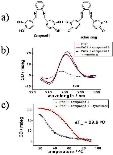 Figure 1. a) Structures of compound 1 and o-quinone intermediate induced by tyrosinase. b) CD spectra of Pu27 DNA (20 μM) in 10 mM Tris/HCl buffer at pH 7.0 in the absence or presence of compound 1 ([compound 1]/[DNA strand] = 5) without or with incubation with tyrosinase (400 Units) at 37°C for 1 h. c) CD melting of Pu27 DNA curves in the presence of compound 1 ([compound 1]/[DNA strand] = 5) without or with incubation with tyrosinase (400 Units) at 37°C for 1 h, as monitored by the CD intensity at 265 nm. Tm values of the two G-quadruplexes are 30.3°C and 59.9°C, respectively.