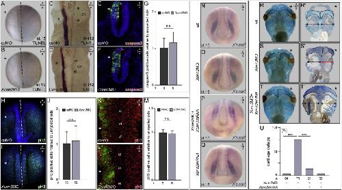 (AâM) No effects on apoptosis (AâG) or proliferation (HâM) in frog (A, B, HâJ) or chick (C-G, KâM) morphants. All error bars represent SD.