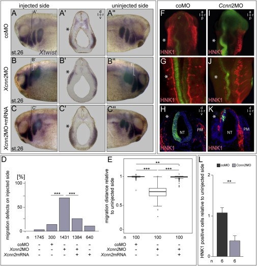 (F–L) Chick. Fluorescent MOs (green) were unilaterally electroporated (asterisks) into the neural tube at the four- to eight-somite stage and analyzed for migratory NCCs by HNK1 staining (red) 16 hr thereafter. Migration of cranial (F) and cervical NCCs (G) was unaffected when coMO was injected, but was inhibited on the injected sides upon Ccnn2MO application (I and J). (H and K) Histological sections at cervical levels of specimens treated with coMO (H) or Ccnn2MO (K).