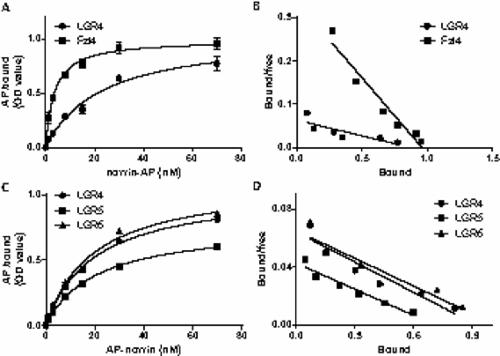 Direct binding of norrin to LGR4, 5 and 6. (A) Saturation curves for AP–norrin binding to LGR4 and Fzl4. After knocking down endogenous LGR4, HEK293T cells were transfected with empty vector or plasmids encoding human LGR4 or Fzl4 for 6 hours. After culturing for 2 days, cells were incubated with AP–norrin for 90 minutes at 23°C before determination of alkaline phosphatase activities. Specific binding was calculated by subtracting the values from cells transfected with the empty plasmids. (B) Scatchard analysis of AP–norrin binding to HEK293T cells expressing LGR4 or Fzl4. (C) Binding of AP–norrin to LGR4, 5 and 6 after knocking down endogenous LGR4. (D) Scatchard analysis of AP–norrin binding to HEK293T cells expressing LGR4, 5 or 6. |