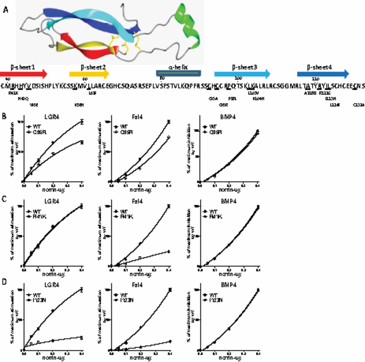 wild type norrin for LGR4 and Fzl4 receptors and as % of maximal inhibition of BRE reporter activities by wild type norrin for BMP4