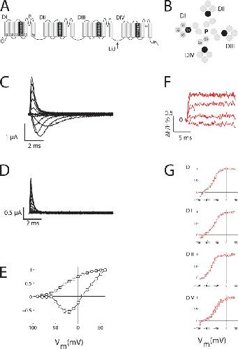 Figure 1. NaV1.4 channel ionic current, gating current, and site-specific fluorescent signals. NaV1.4 currents (black traces) were measured using cut-open oocyte clamp to achieve fast temporal resolution (Stefani et al., 1994) as described in Materials and methods. Changes in fluorescence magnitude (ΔF/F0; red traces) studied in four channels (DI-S216C, DII-S660C, DIII-L115C, and DIV-S1436C) after conjugation to TMRM. Groups of three to six cells reported as mean ± SEM in E and G. (A) Drawing of the NaV1.4 pore-forming subunit indicating four domains, each with six transmembrane segments; each S1–S4 group forms a voltage sensor, and the four S5–S6 spans are reentrant pore loops that create a single conduction pore. The S4 spans (light gray) are indicated (+) to have multiple arg and lys residues that carry the majority of the gating charge. “Lid” indicates hydrophobic triplet on the DIII–DIV linker that is responsible for fast inactivation. (B) Drawing represents the spatial arrangement of four voltage sensors around a central ion conduction pore. (C) Sodium currents. Activation and fast inactivation of ionic current are apparent with steps from a holding voltage of −100 mV to test potentials of −90 to +60 mV for 60 ms (10 ms shown) in 10-mV steps with a 10-s interpulse interval. For all recordings of ionic currents, gating currents were subtracted. (D) Gating current recorded as in C, with 2 µM TTX in the bath to block ionic current. (E) Channel current/voltage (I/V; circles) and gating current/voltage (Q/V; squares) relationships. Protocol as in C and D. Conductance was calculated by normalizing the current to the driving force (Erev = 7.9 mV), which was fit with a Boltzmann of the form 1/(1+ezFRT(V−Vmid)), giving a half-maximal voltage (Vmid) of −29.1 mV and z = 2.4. For the Q/V relationship, the fit gave Vmid = −27.5 mV and z = 1.1. (F) VCF measurements. Fast changes in fluorescence compared with baseline (ΔF/F0) for DI-S216C channels studied by applying steps from a holding potential of −120 mV to test potentials of −140 to 40 mV in 10-mV steps; traces at −140, −100, −60, −20, and 20 mV are shown. (G) Fluorescence/voltage (F/V) relationships for each of the four Nav1.4 domains. Fits as in E gave DI: Vmid = −74.6 mV and z = 1.3; DII: Vmid = −69.4 mV and z = 1.1; DIII: Vmid = −82.4 mV and z = 1.7; and DIV: Vmid = −70.6 mV and z = 1.5. |