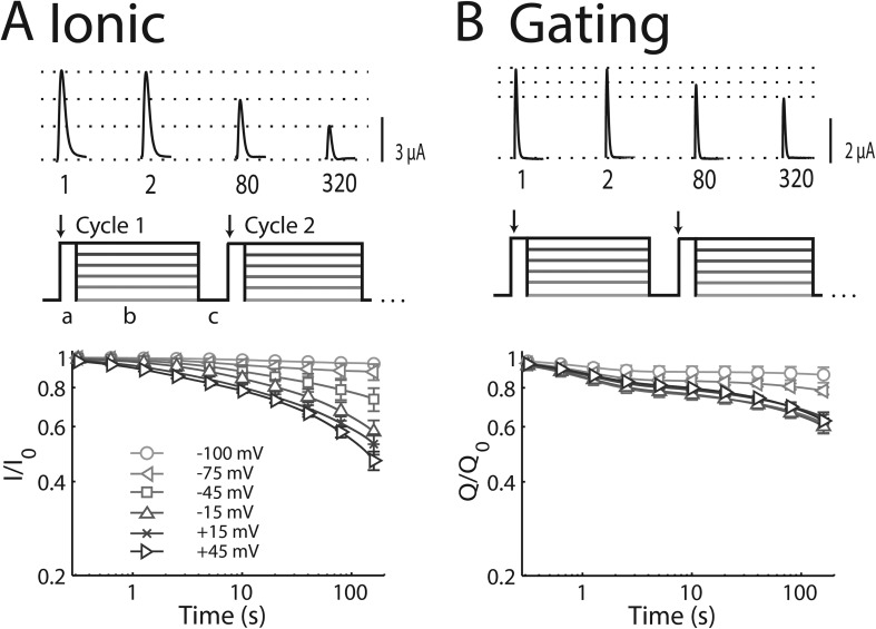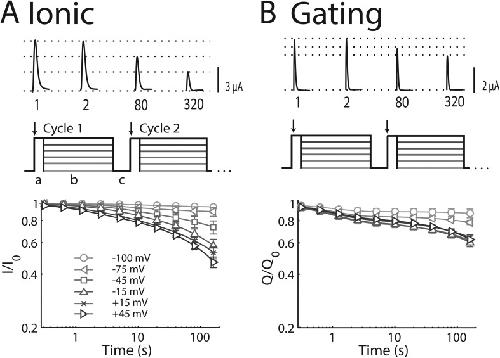 Figure 2. SI onset: Ionic and gating currents. Groups of 4–14 cells reported as mean ± SEM. (A) SI is probed by 320 repetitions of a triple-pulse protocol from a holding potential of −100 mV. A 5-ms test pulse to +45 mV was used to measure peak current (phase a); SI was induced by a 500-ms pulse at −100, −75, −45, −15, 15, or 45 mV (phase b); and a 30-ms pulse at −100 mV was used (phase c) to allow for recovery from fast inactivation before the next test pulse. Above protocol, sample traces from cycles 1, 2, 80, and 320 show progressive decrease in peak current with SI at +45 mV. Parameters for SI onset are reported in Table 1. (B) Loss of gating current with SI induced as in A. (Top) Sample traces from cycles 1, 2, 80, and 320 show progressive reduction in peak gating current with SI at +45 mV. (Bottom) Plot of the gating charge (Q, the integral of the gating current) with time at different potentials. |