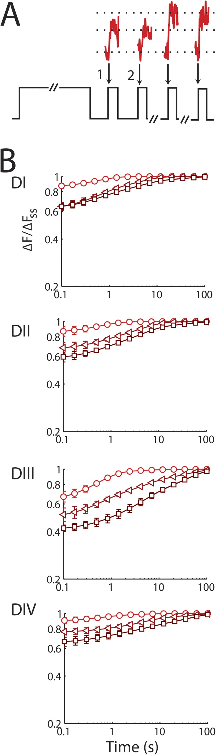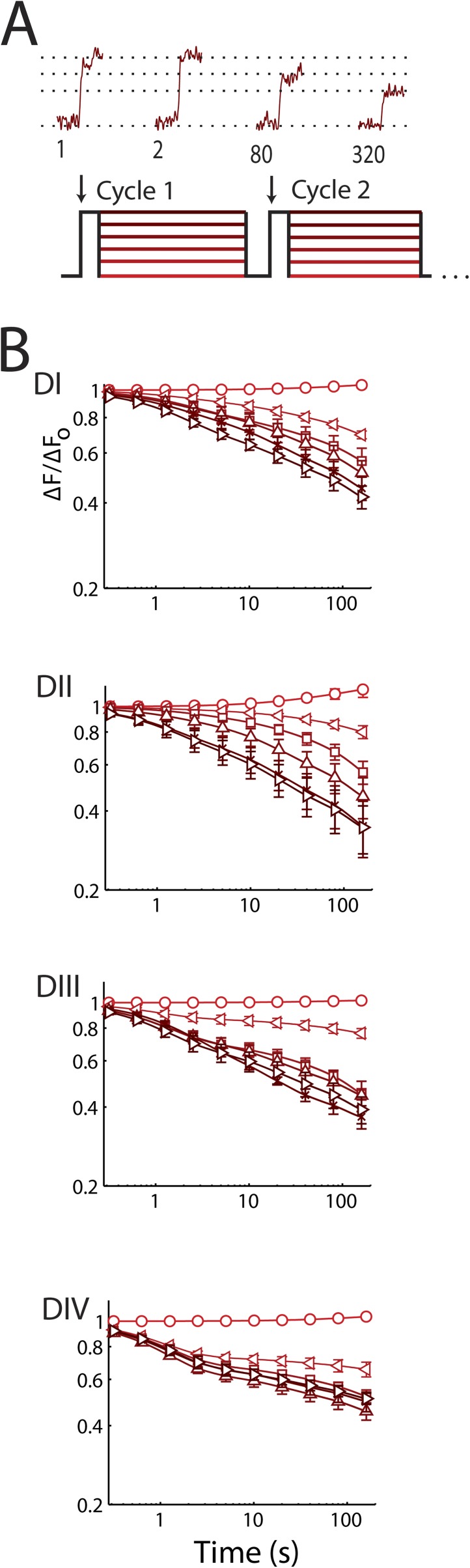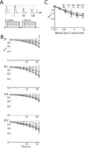 Figure 4. Voltage-sensor immobilization is observed with SI in all four domains. Changes in fluorescence magnitude (ΔF/F0) of TMRM conjugated to each domain via DI-S216C, DII-S660C, DIII-L115C, or DIV-S1436C. The mean ± SEM for groups of six to eight cells is reported. (A) Fluorescence. (Top) Application of the triple-pulse protocol reveals reduction in the ΔF/F0 with increasing cycle number: 4 ms before and 4 ms after the test step to +45 mV (phase a) for the indicated pulse is shown. (B) Time-dependent change in the magnitude of ΔF/F0 for the four channels on log–log plots using the triple-pulse protocol described in Fig. 2 A. Parameters are shown in Table 1. DI and DII show changes with voltage and cycle number that are most reminiscent of SI. |