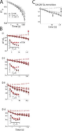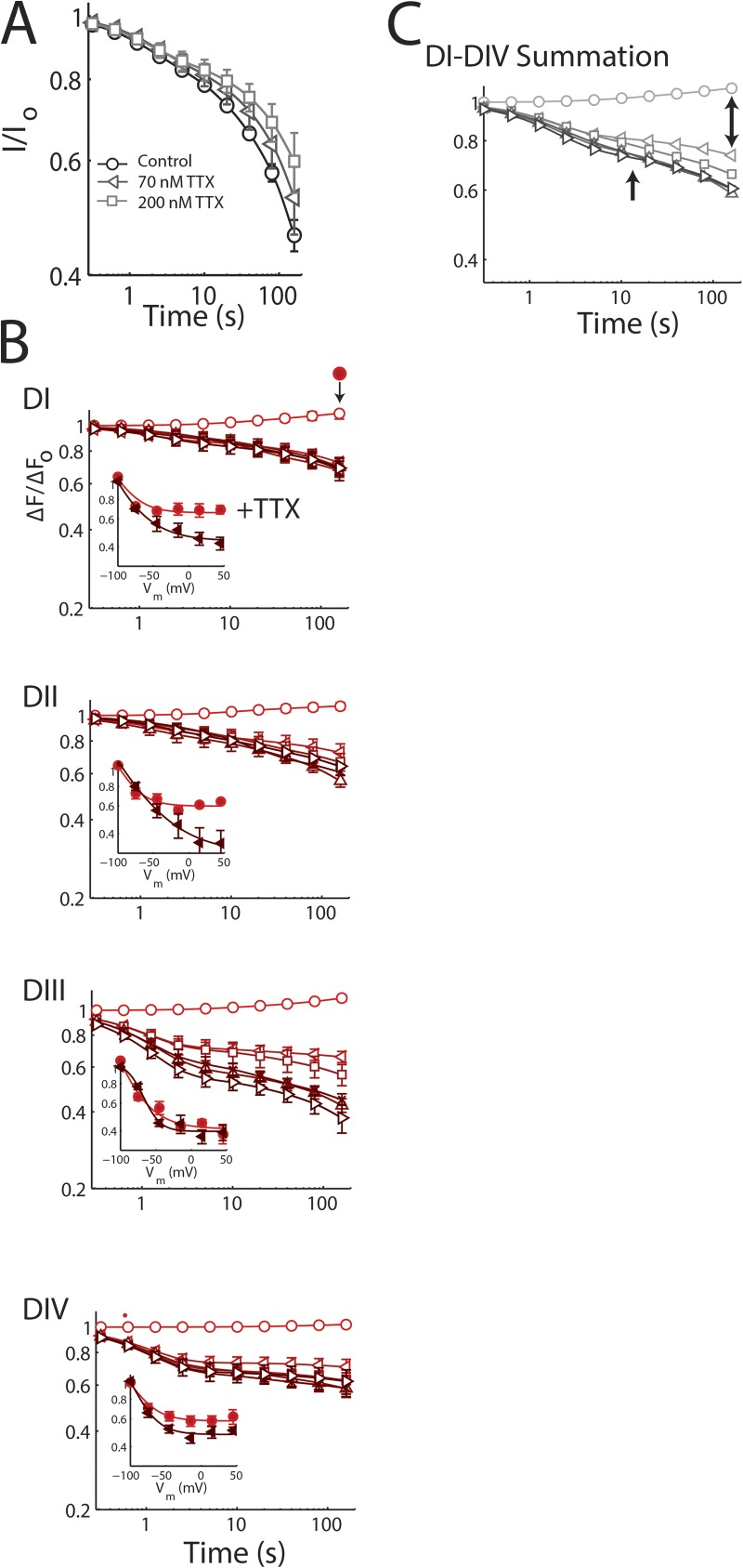 Figure 5. Immobilization of DI and DII voltage sensors is suppressed by TTX. Changes in the fluorescence magnitude (ΔF/F0) of TMRM conjugated to each domain via DI-S216C, DII-S660C, DIII-L115C, or DIV-S1436C in the presence of 2 µM TTX. The mean ± SEM for groups of 5–14 cells is reported. (A) Ionic currents. SI in wild-type channels in the absence and presence of the indicated levels of TTX by the protocol shown in Fig. 2 A. TTX inhibition decreases SI (P = 0.038 for 200 nM vs. control). (B) Fluorescence recordings as in Fig. 4 B with TTX. Parameters are shown in Table 2. DI and DII voltage sensors are significantly affected and are now reminiscent of gating currents. Insets compare immobilization for the indicated domain at 160 s with TTX (bright circles) and without TTX (dark triangles). (C) Expected gating charge immobilization based on fluorescence measurements. Each domain was assumed to carry 25% of the gating charge, and the traces represent the sum (see Results). |