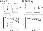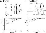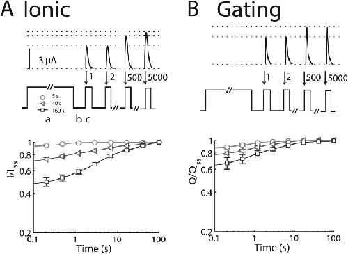 Figure 6. Recovery from SI: Ionic and gating currents. Changes in ionic and gating current as channels recover from SI. The mean ± SEM for groups of four to five cells is reported. (A) Sodium current. (Top) Recovery from SI is probed after induction pulses to +45 mV for 5, 40, or 160 s (phase a) during 5,000 cycles of 20 ms at −100 mV (phase b), followed by 4 ms at +45 mV when peak current is recorded (phase c). Sample traces from cycles 1, 2, 500, and 5,000 show the recovery of peak current. (Bottom) Voltage and cycle dependence of recovery from SI on log–log plots of peak current normalized to the steady-state (change of <1%) current after recovery. Parameters for recovery from SI are shown in Table 3. (B) Gating current. Recovery from SI is probed as in A, with 2 µM TTX. |