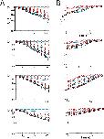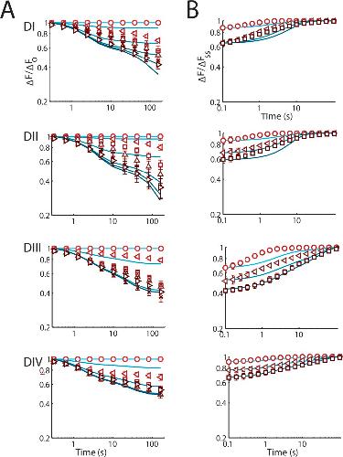 Figure 8. Models of voltage-sensor slow immobilization. Experimental data are shown with symbols, and models are represented by solid blue lines. The effect of the protocol was removed for model fitting by subtracting the minimal changes in voltage-sensor activation observed with pulses to −100 mV. For fitting, experimental recovery is scaled so that it begins recovering from exactly the same fraction where onset terminated. Ionic current recovery is simulated using the same parameters and models used to simulate ionic onset (Table 5). These simplified models are qualitatively similar to the inactivation of the voltage sensors. (A) Model voltage-sensor slow immobilization for all four domains. (B) Model voltage-sensor recovery from slow immobilization for all four domains. |