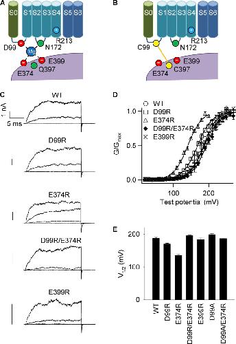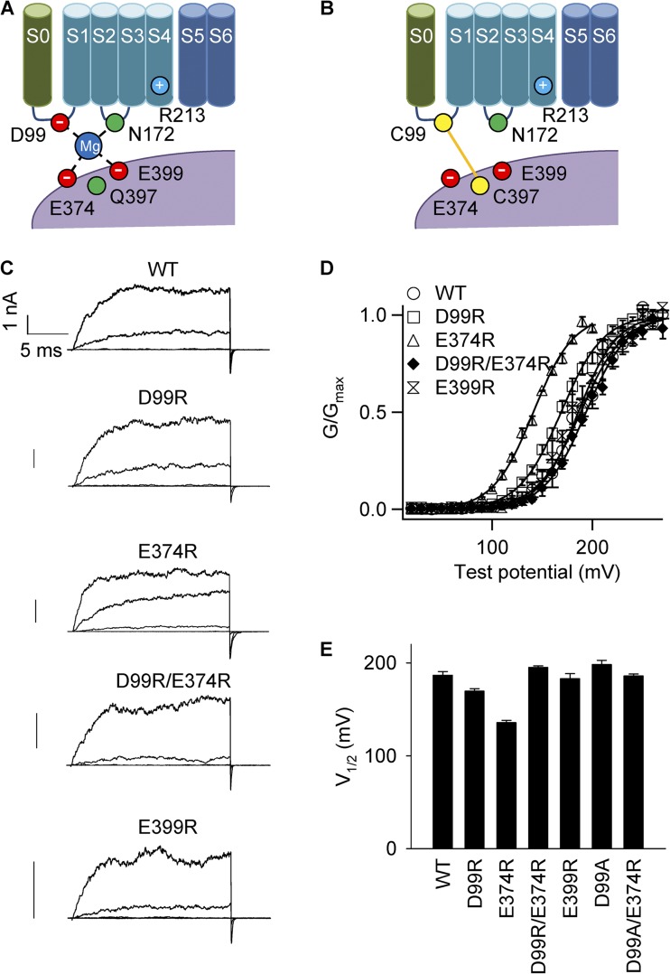 Figure 1. D99 and E374 interact with each other at the domain interface of BK channels. (A) Cartoon showing the molecular mechanism of Mg2+ activation. S0–S6 are membrane-spanning segments. Mg2+ is coordinated by four residues including D99 and N172 from the membrane-spanning domain and E374 and E399 from the cytosolic domain. Bound Mg2+ interacts with R213 of the membrane-spanning domain to activate channel. Located in the vicinity of the Mg2+-binding site is residue Q397, which may interact with R213 when charged. (B) Cartoon showing the spontaneous formation of a disulfide bond between C99 and C397 located in the membrane-spanning and cytosolic domains, respectively. (C) Macroscopic current traces of inside-out patches expressing WT BK channels and D99R, E374R, D99R/E374R, and E399R mutant channels. Currents were elicited by voltages ranging from 0 to 200 mV, with 50-mV increments. The voltage was −50 mV before and −80 mV after the pulses. [Ca2+]i: 0 µM. Bars, 1 nA. (D) G-V relations of WT, D99R, E374R, D99R/E374R, and E399R. [Ca2+]i: 0 µM. Solid lines are fittings to the Boltzmann equation. The fitting parameters are: WT (n = 4): V1/2 = 187 ± 4 and z = 1.29 ± 0.12; D99R (n = 14): V1/2 = 170 ± 3 and z = 1.31 ± 0.03; E374R (n = 6): V1/2 = 136 ± 2 and z = 1.29 ± 0.04; D99R/E374R (n = 5): V1/2 = 195 ± 2 and z = 1.21 ± 0.05; E399R (n = 3): V1/2 = 183 ± 5 and z = 1.34 ± 0.10. (E) V1/2 of the G-V relations. The fitting parameters for D99A and D99A/E374R are: D99A (n = 6): V1/2 = 198 ± 5 and z = 1.20 ± 0.05; D99A/E374R (n = 7): V1/2 = 186 ± 2 and z = 1.24 ± 0.06.