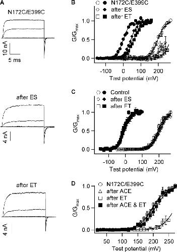 Figure 2. Electrostatic repulsion between residues 172 and 399 inhibits channel activation. (A) Macroscopic current traces of inside-out patches expressing N172C/E399C before and after treatment of negative MTSES(−) (ES) or positive MTSET(+) (ET) reagent. Currents were elicited by voltages of −50, 0, 50, and 100 mV. The voltage was −50 mV before and −120 mV (top) or −80 mV (middle and bottom) after the pulses. [Ca2+]i: 200 µM. (B) G-V relation of N172C/E399C shifts after treatment of ES or ET reagent. Open symbols, [Ca2+]i: 0 µM; closed symbols, [Ca2+]i: 200 µM. Solid lines are fittings to the Boltzmann equation. The fitting parameters are: N172C/E399C untreated, 0 [Ca2+]i (n = 3): V1/2 = 197 ± 5 and z = 1.19 ± 0.22; 200 µM [Ca2+]i (n = 7): V1/2 = 2 ± 7 and z = 1.20 ± 0.09; after MTSES treatment, 0 [Ca2+]i (n = 3): V1/2 = 250 ± 25 and z = 0.86 ± 0.60; 200 µM [Ca2+]i (n = 7): V1/2 = 47 ± 6 and z = 1.13 ± 0.27; after MESET treatment, 0 [Ca2+]i (n = 3): V1/2 = 271 ± 10 and z = 1.19 ± 0.44; 200 µM [Ca2+]i (n = 4): V1/2 = 61 ± 1 and z = 1.13 ± 0.03. (C) G-V relation of the control C430A after treatment of ES or ET reagent. Open symbols: [Ca2+]i: 0 µM; closed symbols: [Ca2+]i: 200 µM. Solid lines are fittings to the Boltzmann equation. The fitting parameters are: C430A untreated, 0 [Ca2+]i (n = 7): V1/2 = 198 ± 2 and z = 1.13 ± 0.03; 200 µM [Ca2+]i (n = 6): V1/2 = −19 ± 4 and z = 1.48 ± 0.08; after MTSES treatment, 0 [Ca2+]i (n = 6): V1/2 = 204 ± 6 and z = 1.11 ± 0.04; 200 µM [Ca2+]i (n = 3): V1/2 = −7 ± 4 and z = 1.26 ± 0.15; after MESET treatment, 0 [Ca2+]i (n = 3): V1/2 = 195 ± 2 and z = 1.09 ± 0.06; 200 µM [Ca2+]i (n = 3): V1/2 = −14 ± 6 and z = 1.54 ± 0.49. (D) G-V relations of N172C/E399C after treatment of neutral MTSACE (ACE) and/or positive ET. [Ca2+]i: 0 µM. Solid lines are fittings to the Boltzmann equation. The fitting parameters are: N172C/E399C untreated (n = 3): V1/2 = 197 ± 5 and z = 1.19 ± 0.22; after MTSACE treatment (n = 4): V1/2 = 199 ± 5 and z = 1.11 ± 0.21; after MTSET treatment (n = 3): V1/2 = 271 ± 10 and z = 1.19 ± 0.44; after MTSACE and MTSET treatments (n = 3): V1/2 = 207 ± 4 and z = 1.19 ± 0.22. N172C/E399C mutation is on the background of C430A to eliminate the effects of MTS reagents on the native C430 (Zhang and Horrigan, 2005).