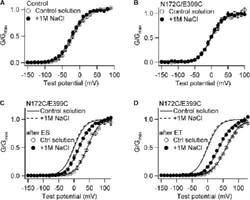 Figure 3. Electrostatic interactions between residues 172 and 399 depend on ionic strength. (A–D) G-V relations in control solution (200 µM [Ca2+]i solution) or in control solution with an additional 1 M NaCl for the control (A), N172C/E399C (B), N172C/E399C after MTSES (C), or N172C/E399C after MTSET (D). All G-V curves are fitted to the Boltzmann equation (lines). The fitting parameters are: the control channel under control solution (n = 6): V1/2 = −19 ± 4 and z = 1.48 ± 0.08; under an additional 1 M NaCl (n = 3): V1/2 = −24 ± 3 and z = 1.36 ± 0.08; N172C/E399C under control solution (n = 7): V1/2 = 2 ± 7 and z = 1.20 ± 0.09; under an additional 1 M NaCl (n = 8): V1/2 = 3 ± 7 and z = 1.32 ± 0.07; N172C/E399C after MTSES under control solution (n = 2): V1/2 = 43 ± 1 and z = 1.32 ± 0.11; under an additional 1 M NaCl (n = 3): V1/2 = 17 ± 2 and z = 1.29 ± 0.05; N172C/E399C after MTSET under control solution (n = 4): V1/2 = 60 ± 1 and z = 1.13 ± 0.03; under an additional 1 M NaCl (n = 4): V1/2 = 39 ± 2 and z = 1.14 ± 0.03. The control and N172C/E399C mutation are on the background of C430A.