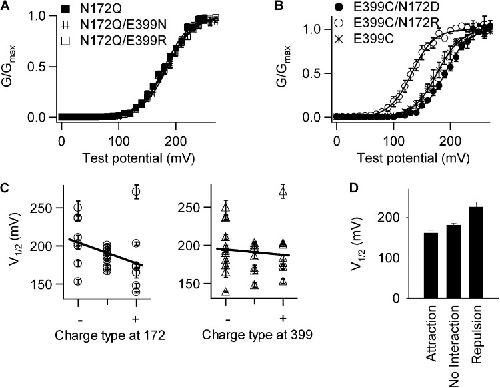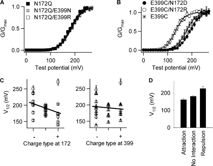 Figure 4. Effects of charge type at residues 172 and 399 on channel activation. G-V relation is shifted by charge type at residue 172 (B) but not by residue 399 (A). [Ca2+]i: 0. Solid lines are fittings to the Boltzmann equation. The fitting parameters are: N172Q (n = 4): V1/2 = 181 ± 5 and z = 1.11 ± 0.20; N172Q/E399N (n = 5): V1/2 = 186 ± 4 and z = 1.15 ± 0.18; N172Q/E399R (n = 5): V1/2 = 184 ± 4 and z = 1.04 ± 0.17; E399C/N172D (n = 8): V1/2 = 188 ± 4 and z = 1.23 ± 0.23; E399C/N172R (n = 5): V1/2 = 132 ± 5 and z = 1.30 ± 0.29; E399C (n = 6): V1/2 = 201 ± 4 and z = 1.23 ± 0.22. (C) V1/2 of a variety of N172 and E399 mutations with or without chemical modifications listed in Table 1 versus charge type at 172 (left) or 399 (right). Solid lines are fittings to linear regression. The slope ± fitting SD of linear regression is −16.1 ± 7.5 for the charge type at 172 and −2.6 ± 7.4 for the charge type at 399. (D) V1/2’s of mutations in Table 1 are averaged based on the interaction type between 172 and 399.