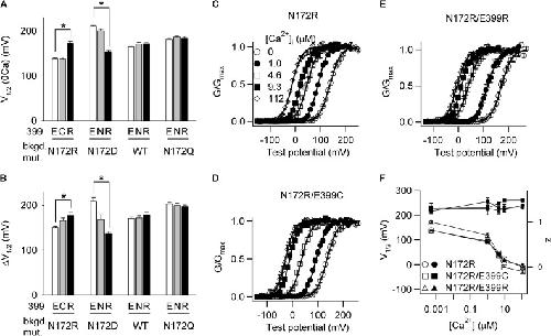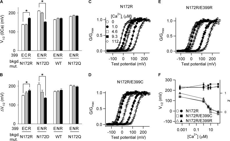 Figure 5. The 172–399 electrostatic interaction alters voltage- and Ca2+-dependent activation. (A) V1/2 at 0 [Ca2+]i indicating changes in voltage-dependent activation. The mutations are grouped such that the negative residue E399 (open bars) is mutated to neutral (gray bars) or positive (closed bars) residues on the backgrounds where residue 172 contains a negative, positive, or no charge. (B) ΔV1/2 = V1/2 at 0 [Ca2+]i − V1/2 at 112 µM [Ca2+]i, indicating Ca2+ activation by saturating [Ca2+]i. Mutations are the same as in A. Asterisks in A and B indicate significant difference between the labeled pairs as identified in multiple comparisons (P < 0.017 as adjusted by the Bonferroni correction). The group of N172R mutations in A and B are made on the background of C430A. There is no significant difference in the number of equivalent gating charges among all the G-V relations. (C–E) G-V relation for N172R (C), N172R/E399C (D), and N172R/E399R (E) in varying [Ca2+]i. Solid lines are fittings to the Boltzmann equation. The fitting parameters of the mutations in A–E are: N172R 0 Ca (n = 4): V1/2 = 139 ± 1 and z = 1.24 ± 0.05; 1.0 Ca (n = 4): V1/2 = 91 ± 2 and z = 1.45 ± 0.09; 4.6 Ca (n = 4): V1/2 = 48 ± 3 and z = 1.31 ± 0.03; 9.3 Ca (n = 4): V1/2 = 23 ± 4 and z = 1.28 ± 0.06; 112 Ca (n = 3): V1/2 = −12 ± 2 and z = 1.37 ± 0.02; N172R/E399C 0 Ca (n = 6): V1/2 = 138 ± 3 and z = 1.33 ± 0.09; 1.0 Ca (n = 5): V1/2 = 95 ± 3 and z = 1.31 ± 0.07; 4.6 Ca (n = 4): V1/2 = 36 ± 2 and z = 1.41 ± 0.03; 9.3 Ca (n = 2): V1/2 = −10 ± 1 and z = 1.48 ± 0.02; 112 Ca (n = 3): V1/2 = −27 ± 6 and z = 1.48 ± 0.04; N172R/E399R 0 Ca (n = 4): V1/2 = 172 ± 4 and z = 1.29 ± 0.05; 1.0 Ca (n = 4): V1/2 = 118 ± 8 and z = 1.30 ± 0.14; 4.6 Ca (n = 4): V1/2 = 41 ± 4 and z = 1.25 ± 0.07; 9.3 Ca (n = 4): V1/2 = 14 ± 2 and z = 1.30 ± 0.09; 112 Ca (n = 3): V1/2 = −4 ± 6 and z = 1.34 ± 0.05; N172D 0 Ca (n = 4): V1/2 = 204 ± 4 and z = 1.18 ± 0.20; 112 Ca (n = 3): V1/2 = 20 ± 5 and z = 0.96 ± 0.15; N172D/E399N 0 Ca (n = 10): V1/2 = 200 ± 4 and z = 1.26 ± 0.07; 112 Ca (n = 2): V1/2 = 32 ± 10 and z = 1.34 ± 0.04; N172D/E399R 0 Ca (n = 4): V1/2 = 153 ± 3 and z = 1.28 ± 0.07; 112 Ca (n = 4): V1/2 = 16 ± 2 and z = 1.02 ± 0.02; WT 0 Ca (n = 7): V1/2 = 164 ± 2 and z = 1.18 ± 0.05; 112 Ca (n = 5): V1/2 = −7 ± 2 and z = 1.55 ± 0.07; E399N 0 Ca (n = 9): V1/2 = 170 ± 4 and z = 1.18 ± 0.03; 112 Ca (n = 5): V1/2 = −1 ± 3 and z = 1.59 ± 0.07; E399R 0 Ca (n = 7): V1/2 = 172 ± 3 and z = 1.30 ± 0.09; 112 Ca (n = 7): V1/2 = −7 ± 6 and z = 1.52 ± 0.05; N172Q 0 Ca (n = 4): V1/2 = 181 ± 2 and z = 1.11 ± 0.09; 112 Ca (n = 5): V1/2 = −22 ± 2 and z = 1.42 ± 0.05; N172Q/E399N 0 Ca (n = 5): V1/2 = 186 ± 3 and z = 1.11 ± 0.07; 112 Ca (n = 4): V1/2 = −14 ± 4 and z = 1.43 ± 0.05; N172Q/E399R 0 Ca (n = 5): V1/2 = 184 ± 3 and z = 1.10 ± 0.02; 112 Ca (n = 4): V1/2 = −13 ± 3 and z = 1.46 ± 0.07. All these mutations are on the C430A background. (F) V1/2 (open symbols) and z (closed symbols) versus [Ca2+]i for the G-V relations in C–E.
