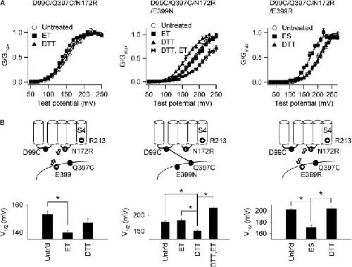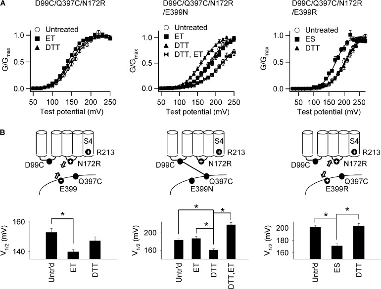 Figure 6. The 172–399 electrostatic interaction disrupts the formation of the interdomain disulfide bond. (A) G-V relations before (open circles) and after (closed symbols) treatment of MTSET (ET), MTSES (ES), or DTT when E399 is mutated to Asn (middle) or Arg (right) on the background of D99C/Q397C/N172R (left). “DTT, ET” in the middle panel represents the treatment of DTT followed by MTSET. [Ca2+]i: 0. Solid lines are fittings to the Boltzmann equation. The fitting parameters are: D99C/Q397C/N172R untreated (n = 8): V1/2 = 153 ± 3 and z = 1.3 ± 0.02; after ET (n = 5): V1/2 = 140 ± 2 and z = 1.37 ± 0.04; after DTT (n = 6): V1/2 = 147 ± 3 and z = 1.28 ± 0.06; D99C/Q397C/N172R/E399N untreated (n = 6): V1/2 = 183 ± 3 and z = 1.14 ± 0.07; after ET (n = 8): V1/2 = 187 ± 5 and z = 1.07 ± 0.05; after DTT (n = 11): V1/2 = 161 ± 3 and z = 1.26 ± 0.04; after DTT and ET (n = 3): V1/2 = 218 ± 5 and z = 0.88 ± 0.06; D99C/Q397C/N172R/E399R untreated (n = 9): V1/2 = 202 ± 3 and z = 1.20 ± 0.03; after ES (n = 7): V1/2 = 171 ± 3 and z = 1.33 ± 0.07; after DTT (n = 8): V1/2 = 203 ± 4 and z = 1.12 ± 0.05. (B) V1/2 of the G-V relations shown in A for the corresponding mutations and chemical modifications. Cartoons on the top show the type of the 172–399 electrostatic interactions (arrows) as a result of residue 399 charges and its consequence on the formation of the disulfide bond between D99C and D397C (line) based on the results (see Results). Asterisks indicate significant difference between labeled pairs as identified in multiple comparisons (P < 0.017 for the left and right panels and P < 0.0083 for the middle panel as adjusted by the Bonferroni correction). All the mutations are on the background of C430A.