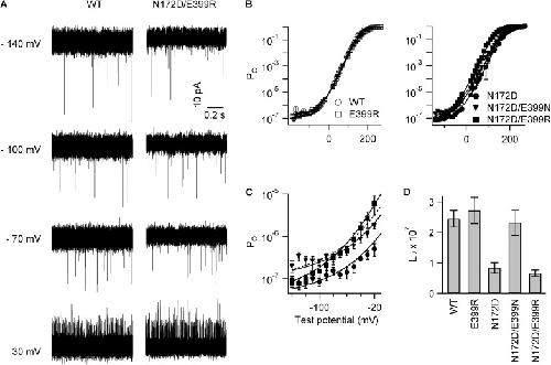 Figure 7. The 172–399 electrostatic interaction alters the intrinsic open probability of the activation gate. (A) Current traces of unitary openings (thin spikes) elicited by indicated voltages from inside-out patches expressing hundreds of channels. [Ca2+]i = 0. (B) PO-V relation for WT and E399R (left), N172D, N172D/E399N, and N172D/E399R (right). [Ca2+]i = 0. Solid lines are fittings to the HCA model (Eq. 2) (n ≥ 5). Dashed line in the right panel is the HCA fitting for WT. (C) Enlarged PO-V relations in the right panel of B at the negative voltage range. (D) L0 of the HCA model. Error bars represent 95% confidence intervals. The HCA model has fixed parameters (zL = 0.1 and zJ = 0.57), whereas L0, Vhc, and Vho are optimized for the best fitting. Vhc and Vho values (mV) are as follows (parameter ± 95% confidence interval): WT: Vhc = 172 ± 8 and Vho = −18 ± 3; E399R: Vhc = 164 ± 9 and Vho = −15 ± 4; N172D: Vhc = 188 ± 10 and Vho = −11 ± 4; N172D/E399N: Vhc = 173 ± 9 and Vho = −13 ± 4; N172D/E399R: Vhc = 168 ± 10 and Vho = −54 ± 3.
