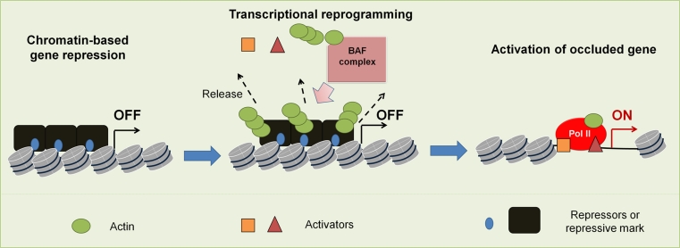 Proper regulation of transcription is essential for cells to acquire and maintain cell identity. Transcriptional activation plays a central role in gene regulation and can be modulated by introducing transcriptional activators such as transcription factors. Activators act on their specific target genes to induce transcription. Reprogramming experiments have revealed that as cells become differentiated, some genes are highly silenced and even introduction of activators that target these silenced genes does not induce transcription. This can be explained by chromatin-based repression that restricts access of transcriptional activators to silenced genes. Transcriptional activation from these genes can be accomplished by opening chromatin, in addition to providing activators. Once a de novo transcription network is established, cells are differentiated or reprogrammed to a new cell type. Emerging evidence suggests that actin in the nucleus (nuclear actin) and nuclear actin-binding proteins are implicated in these transcriptional regulatory processes. This review summarizes roles of nuclear actin and actin-binding proteins in transcriptional regulation. We also discuss possible functions of nuclear actin during reprogramming in the context of transcription and chromatin remodeling.