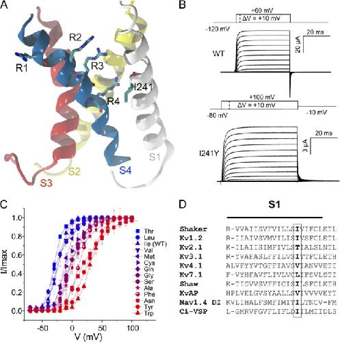 Figure 1. Effect of I241 mutations on Shaker channel gating. (A) Zoomed view of the refined structure of the Kv1.2 voltage sensor (PDB 3LUT; Chen et al., 2010) showing the S1 (white), S2 (yellow), S3 (red), and S4 (blue) helices, the four S4 Arg R1–R4 and the residues I241. (B) Ionic current traces for WT Shaker (top) and I241Y mutant (bottom) recorded using the indicated protocol. (C) G-V curves of Shaker channels as a function of the residue present at position 241. The curves are colored gradually from blue to red relative to their position on the voltage axis from negative to positive potentials. (D) Sequence alignments of the S1 segment (T-Coffee) showing the amino acid at the position homologue to I241 (boxed) in various voltage sensors containing proteins (Shaker, GI: 13432103; Kv1.2, GI: 4826782; Kv2.1, GI: 4826784; Kv3.1, GI: 76825377; Kv4.1, GI: 27436981; Kv7.1, GI: 32479527; Shaw, GI: 220901931; KvAP, GI: 38605092; Nav1.4 domain I, GI: 292495096 and Ci-VSP, GI: 76253898). |
