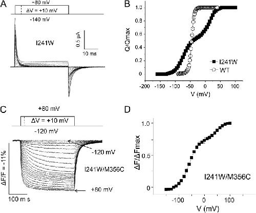Figure 3. I241W transiently immobilizes S4. (A) Family of gating currents recording for the I241W mutant. (B) Q-V plots for the WT and I241W channels. (C) Family of fluorescence recordings of a tetramethylrhodamine-maleimide fluorophore attached to M356C in the I241W mutant. (D) F-V curve of the labeled I241W/M356C mutant obtained from an isochronal plot of the fluorescence intensities at the end of 300-ms test pulses. |