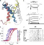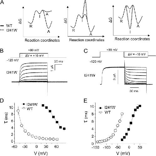 Figure 4. Hypothetical mechanisms for the I241W phenotype. (A) Hypothetical energy diagram of the VSD transitions showing the resting (R), intermediate (I), and active (A) states at a voltage of 0 mV. The dotted lines indicate possible effects of the I241W mutation: destabilization of the active state (left), increase of the energy barrier between the intermediate and active states (middle), and stabilization of the intermediate state (right). (B) Activation ionic currents recordings for I241W channels. (C) Deactivation ionic currents recordings for I241W channels. (D) τ–V plots for WT and I241W channels during activation. (E) τ–V plots for WT and I241W channels during activation. |