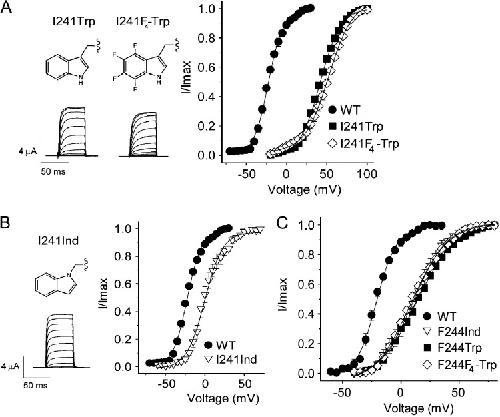 Figure 8. Investigations of the I241W and F244W mutants with nonnatural amino acids. (A, left) Representative current recordings of Shaker channel bearing the natural Trp or the unnatural F4-Trp side chain at position 241. 50-ms depolarizing pulses were used in 5-mV increments from −20 mV to +100 mV with a holding potential of −80 mV. (Right) G-V curves for WT I241 (black circles, V1/2 = −22.3 ± 0.6 mV; Z = 2.9 ± 0.3, n = 5), I241Trp (black squares, V1/2 = 41.9 ± 0.5 mV; Z = 1.9 ± 0.1; n = 5) and I241F4-Trp (open diamonds, V1/2 = 51.9 ± 1.3 mV; Z = 1.8 ± 0.2; n = 5). (B, left) Representative current recordings of Shaker channel bearing the Ind side chains at position 241. 50-ms depolarizing pulses were used in 5-mV increments from −60 mV to +60 mV with a holding potential of −80 mV. (Right) G-V curves for WT I241 (black circles, V1/2 = −22.3 ± 0.6 mV; Z = 2.9 ± 0.3; n = 5) and the I241-Ind mutant (open triangles, V1/2 = 0.6 ± 2.9 mV; Z = 2.5 ± 0.3; n = 6). (C) G-V curves of WT Shaker (black circles), the F244Trp mutant (black squares), the F244F4-Trp mutant (open diamonds), and the F244-Ind mutant (open triangles). |