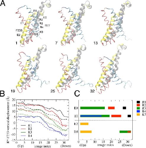 Figure 9. Simulation of the VSD trajectory using the string method. (A) The figure shows selected snapshots of VSD conformations along the converged path from the string method. The numbers indicate the positions from the initial linear path between the up (image #1) and down (image #32) states. The coloring method for S1–S4 is the same as in Fig. 1 A. The side chains of F233 (F290 in Shaker), I177 (I241 in Shaker) E0-2, D3, and R1–R4 are shown in all snapshots in licorice representation. (B) Vertical Z-distance of the S4 arginines relative to the center-of-mass of F233 side chain along the optimized path. The solid and dashed lines correspond to the distance relative to the R1–4 Cζ and R1–4 Cα, respectively. (C) Transient salt bridges analysis along the optimized path; according to the color code, a color corresponding to a particular arginine/lysine is drawn at an image if in the corresponding configuration there is a salt bridge between the basic and the acidic residue. The index of the images along the path is reported on the x-axis, and the acidic amino acids making interactions with the S4 arginines are reported on the y-axis. The horizontal dashed line schematically separates the extracellular region (above) from the intracellular (below). |