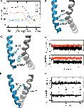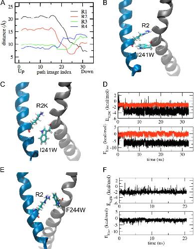 Figure 10. A possible mechanism for the I241W and F244W phenotypes. (A) Graph showing the distances between I241 (Cβ) and R1–R4 (Cζ) along the pathway obtained by the string method. The mutations I241W (B) and I241W/R2K (C) were independently introduced in silico in the conformation having the minimal I241-R2 distance (image #25) and equilibrated for 32 ns. Only the side chains were allowed to move during the two equilibrations. (D) The graph shows the vdW (top) and electrostatic (bottom) interaction energies between I241W and R2 (black) or between I241W and R2K (red) during the two simulations. (E) The mutation F244W was introduced in silico in image #22 giving the minimal F244-R2 (Cβ-Cζ) distance and equilibrated for 20 ns. The cartoon shows the side chains of R2 and F244W after equilibration. (F) The graph shows the vdW (top) and electrostatic (bottom) interaction energies between F244W and R2 during the simulation. |
