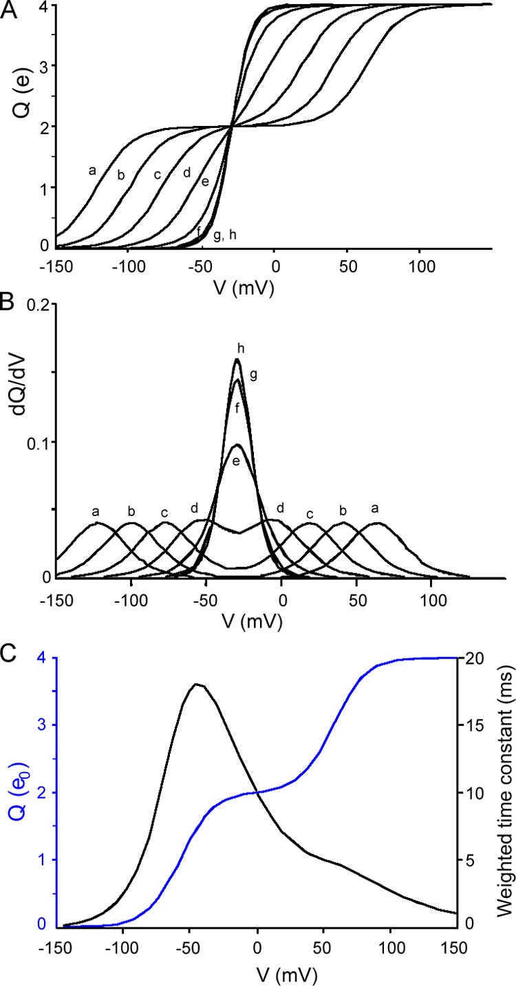Figure 11. Simulations with the 3-state model. (A) Q-V curves computed for several values of K1 and K2, as follows (a): K1 = 0.0001, K2 = 166.7, s = 14.8; (b): K1 = 0.0004, K2 = 27.8, s = 11.2; (c): K1 = 0.0022, K2 = 4.63, s = 7.67; (d): K1 = 0.013, K2 = 0.77, s = 4.09; (e): K1 = 0.078, K2 = 0.129, s = 0.5. The next three curves are (f): K1 = 0.467, K2 = 0.021, s = −3.08; (g): K1 = 2.8, K2 = 0.0036, s = −6.66; and (h): K1 = 16.8, K2 = 0.0006, s = −10.25. Curves e–h can be well fit by a single Boltzmann given apparent valences of 2.36, 3.54, 3.91, and 3.99, respectively. (B) First derivative of the Q-V curves shown in part A. (C) Q-V and weighted time constant versus V curves computed with the 3-state model with the following parameters: z1f = 0.5, z1b = 1.5, z2f = 1.2, z2b = 0.8, α10 = 0.1, β10 = 0.001, α20 = 0.001, β20 = 0.1. |