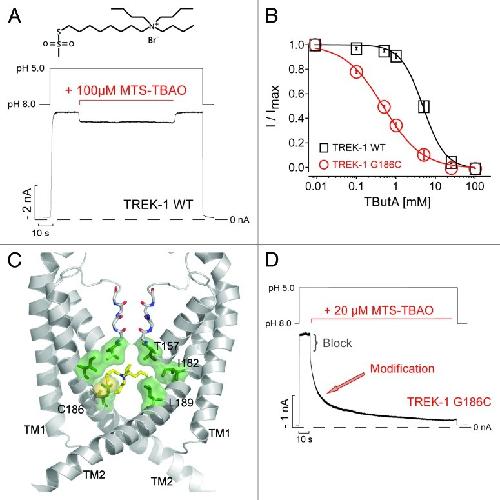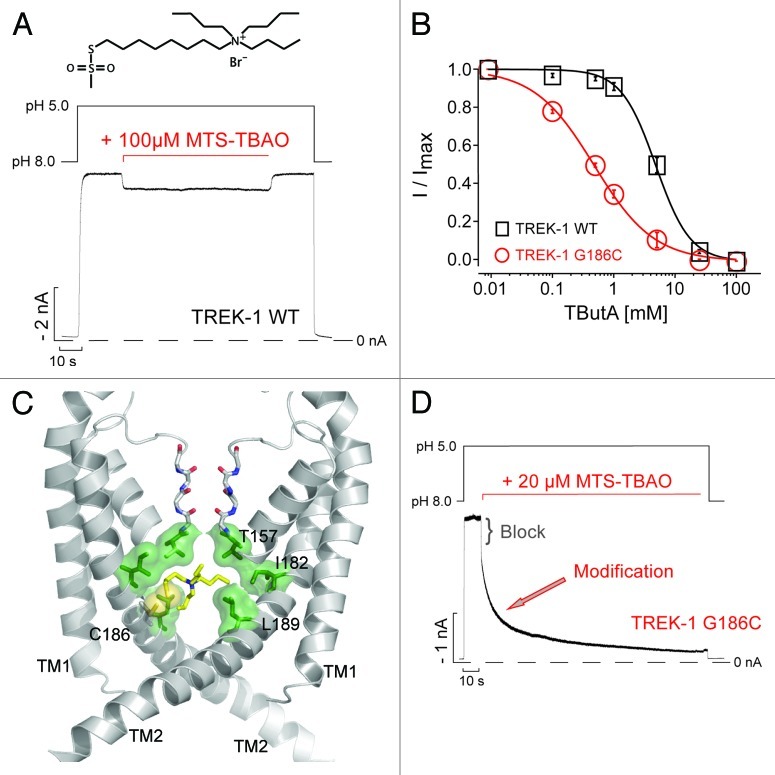 Figure 2. MTS-TBAO block and modification of TREK-1. (A) TREK-1 channel currents expressed in Xenopus oocytes measured at -80 mV in inside-out patches, activated from pH 8 by pH 5 and exposed to MTS-TBAO for 120 sec. A small and reversible block [8.2 ± 0.5% at 100 µM; (n = 4)] by the TBAO-moiety was obtained. (B) Concentration-response curves for tetrabutylammonium (TButA) inhibition of wild-type TREK-1 and G186C channels fitted to a standard Hill function with IC50 values and Hill-coefficients of 4.8 ± 0.3 mM and 1.4 ± 0.1 (n = 5) for wt; 0.5 ± 0.1 mM and 1.1 ± 0.1 for G186 (n = 6). Data points represent mean ± SEM (C) Structural model of the P1 subunits in the TREK-1 pore, the M3 and M4 helices from the P2 subunit are removed for clarity. The MTS-TBAO was linked to the introduced cysteines at position 186 with the SH-group in yellow, which is located in close proximity to the predicted QA binding site (green). (D) Application of MTS-TBAO on TREK-1-G186C mutant channels results in an initial fast block [24.2 ± 1% at 20 µM; (n = 5)] followed by a monoexponential time course [τ = 18.6 ± 3.9 sec; (n = 5)] for the modification of this cysteine that irreversibly reduced the current by up to 90%.