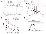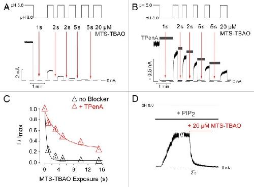 Figure 3. State-independent access of MTS-TBAO to the inner pore of TREK-1. (A) TREK-1 currents activated by pH 5 were exposed to repeated applications of 20 µM MTS-TBAO at pH 8 for the times indicated by the arrows in order to test the accessibility of Cys-186 in the closed state. (B) A similar experiment performed in the presence of 1 mM TPenA, which blocks TREK-1 with an IC50 of 13 ± 1 µM.8 The channels were exposed to the blocker during the time indicated by the horizontal bars that resulted in complete inhibition of the current. Twenty µM MTS-TBAO was then applied to the blocked channel at times indicated by the arrows. (C) Time course of the relative current decline from experiments such as those shown in panelsA and B as a function of cumulative reagent exposure (Modification Time x [MTS-TBAO]) resulted in a monoexponential time course of 0.7 ± 0.1 sec (n = 6) in absence and 8.2 ± 0.9 sec (n = 3) in the presence of 1 mM TPenA. Data points represent mean ± SEM. (D) Activation of TREK-1-G186C mutant channels by 10 µM PtdIns(4,5)P2 at pH 8 and subsequent application of MTS-TBAO irreversibly reduced the current. The decay of the current was fitted to a monoexponential function with a Tau (τ) of 1.2 ± 0.1 sec (n = 3).