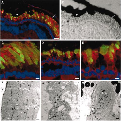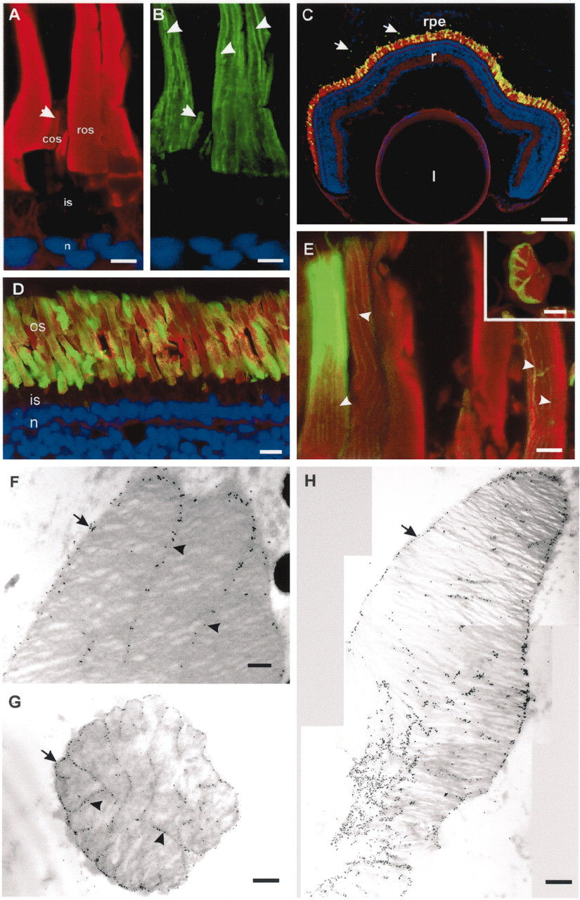 Figure 2. Endogenous peripherin-2 and WT peripherin-2-GFP localize to the ROS disk rims and incisures. (A and B) X. laevis retina was labeled with TR-WGA (red) and antiperipherin-2 Xper5A11 antibody (green) and stained with Hoescht 33342 (blue). (A) TR-WGA labeling of glycoproteins in rod (ros) and cone (cos) outer segments; inner segment (is) and nuclei (n) are not labeled; (B) peripherin-2 labeling along the disk rims and incisures (arrowheads) and one edge of the cos (arrow). Bar, 5 μm. (CâE) Cryosections of 4-week-old tadpole eyes expressing WT Xenopus peripherin-2-GFP (green) and stained with TR-WGA (red) and Hoescht 33342 (blue). (C) Retina expressing Xenopus peripherin-2-GFP in ROS. Fusion protein is also present in phagosomes in retinal pigment epithelial cells (arrow). l, lens; r, retina; rpe, retinal pigment epithelium; Bars, 100 μm. (D and E) Micrographs of retinas expressing Xenopus peripherin-2-GFP at higher magnification showing peripherin-2-GFP localized to the ROS disk rims and incisures (arrowheads). Bars, 10 μm (D) and 5 μm (E); (Inset) Cross section of a ROS. Bar, 1 μm. All detectable WT peripherin-2-GFP localized to the ROS. F-H. Electron micrographs of retina labeled for Xenopus peripherin-2-GFP with an anti-GFP antibody and immunogold markers. (F) Longitudinal section (Bar, 0.2 μm) and (G) transverse section (Bar, 0.5 μm) of a rod expressing moderate levels of fusion protein. Peripherin-2-GFP is present on the disk rims (arrows) and incisures (arrowheads). (H) Composite longitudinal section of a ROS expressing high levels of the fusion protein. Some missorting of the fusion protein to the disk lamellae and constriction of the rod outer segment is evident. Bar, 0.5 μm. |