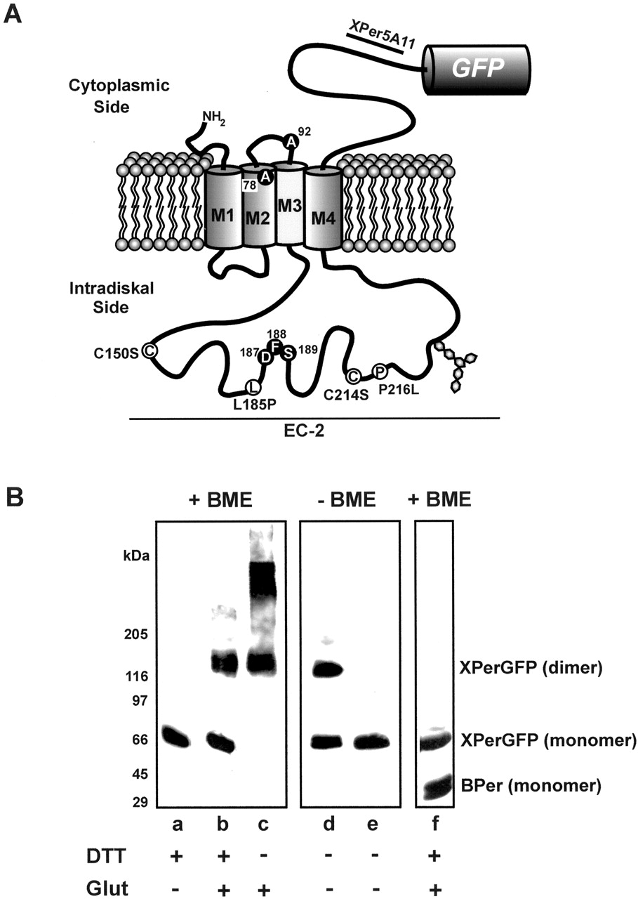 Figure 1. Analysis of Xenopus peripherin-2-GFP fusion protein. (A) Topological model for Xenopus peripherin-2 showing the location of the GFP fusion protein, the epitope for the Xper5A11 mAb, mutations analyzed in this study (white circles), and amino acids that differ from the published sequence (black circles). (B) Western blots of Xenopus peripherin-2-GFP expressed in COS-1 cells. COS-1 membranes were preincubated with or without DTT, solubilized in Triton X-100, treated with or without glutaraldehyde (Glut), and fractionated on SDS gels under reducing (+BME, β-mercaptoethanol) or nonreducing (-BME) conditions. Lanes aâd: WT Xenopus peripherin-2-GFP labeled with an anti-GFP antibody. Lane e: C150S Xenopus peripherin-2-GFP labeled with anti-GFP antibody. Lane f: Coexpression and coimmunoprecipitation of Xenopus peripherin-2-GFP (XPerGFP) and bovine peripherin-2 (BPer) with bovine specific Per2B6-Sepharose. Western blots were labeled with an anti-GFP antibody to detect XperGFP and the Per2B6 antibody to detect BPer. |