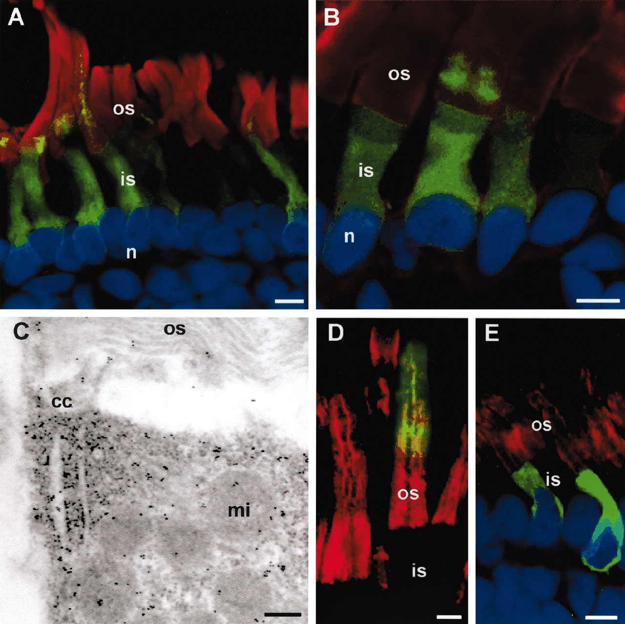 Figure 3. C214S peripherin-2-GFP is retained in the rod inner segment and cell body. (A and B) Confocal micrographs of Xenopus retinas expressing Xenopus C214S-peripherin-2-GFP (green) and labeled with TR-WGA (red) and Hoescht 33342 (blue). All rod photoreceptors expressing C214S peripherin-2-GFP showed localization of the fusion protein in the rod inner segments and cell bodies; in a small number of high expressing cells, however, some fusion protein is also detected at the base of the ROS. (C) Electron micrograph of immunogold labeling of C214S-peripherin-2-GFP showing protein accumulation near the cilium. (D) Confocal micrograph of a Xenopus retina expressing bovine WT-peripherin-2-GFP (green) and labeled for endogenous Xenopus peripherin-2 with Xper5A11 antibody (red). The WT bovine fusion protein, like endogeneous Xenopus peripherin-2 localizes to the ROS. (E) Xenopus retina expressing bovine C214S-peripherin-2-GFP (green) and labeled for endogenous Xenopus peripherin-2 (red). The C214S fusion protein does not localize to ROS or affect the targeting of endogenous peripherin-2 to the ROS. os, outer segment; is, inner segment; n, nucleus; cc, connecting cilium; mi, mitochondrion. Bars: (A, B, D, and E) 5 μm; (C) 0.2 μm. |