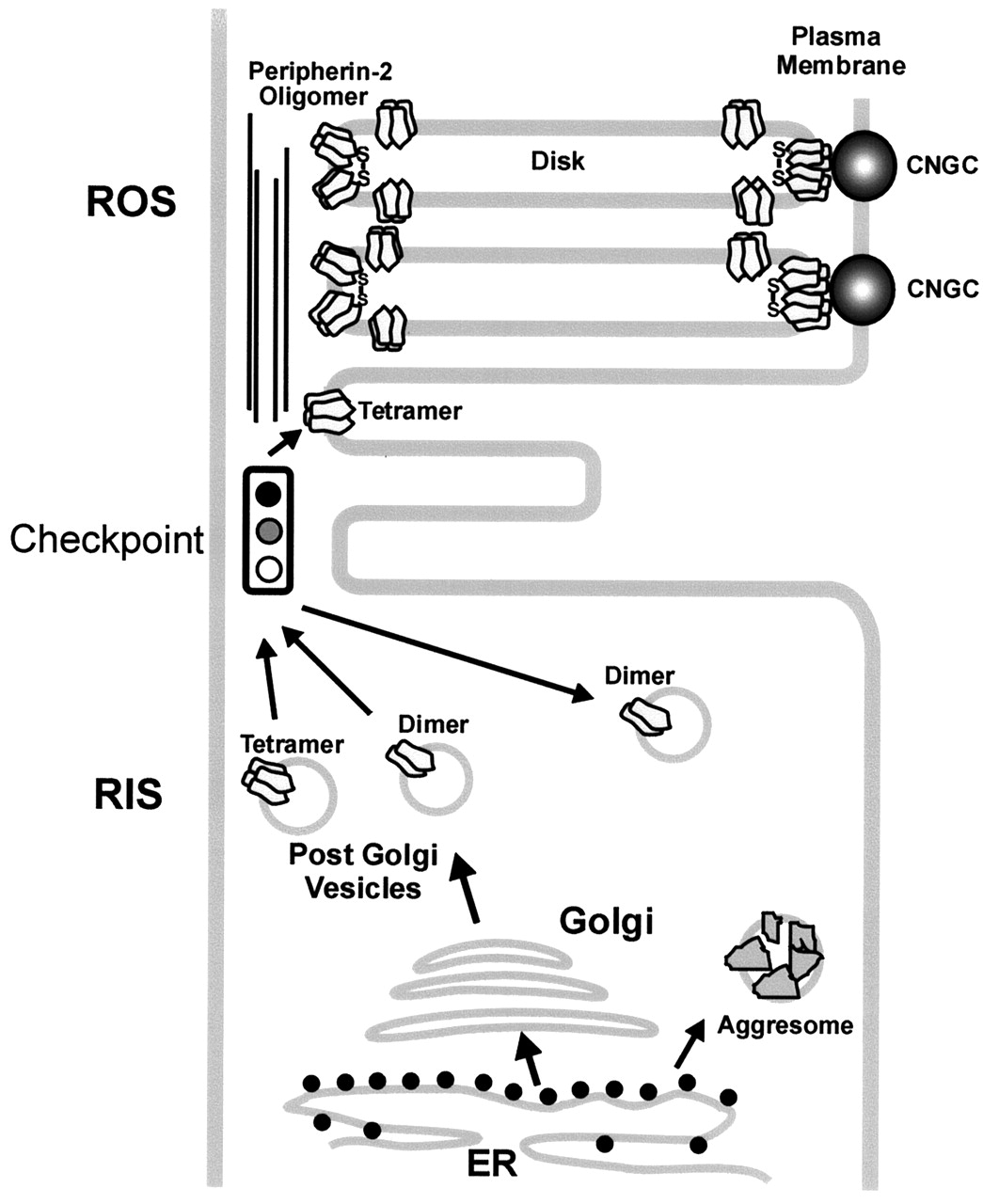 Figure 9. Model depicting a checkpoint that allows only correctly assembled peripherin-2 tetramers to be incorporated into nascent disks. Peripherin-2 tetramers and a significant fraction of dimers are processed through the ER and Golgi and exit as peripherin-2–containing post-Golgi vesicles in the rod inner segment (RIS). These vesicles are translocated to the base of the connecting cilium. A checkpoint prevents peripherin-2 dimers (C214S and L185P homodimers) from being incorporated into the rod outer segment (ROS) disks. Peripherin-2 tetramers and disulfide-linked oligomers, however, are incorporated into nascent disks and localize to the rims and incisures of mature disks. Interaction of peripherin-2 in the disk rim with the cyclic nucleotide-gated channel (CNGC) in the plasma membrane is also shown (Poetsch et al., 2001). |