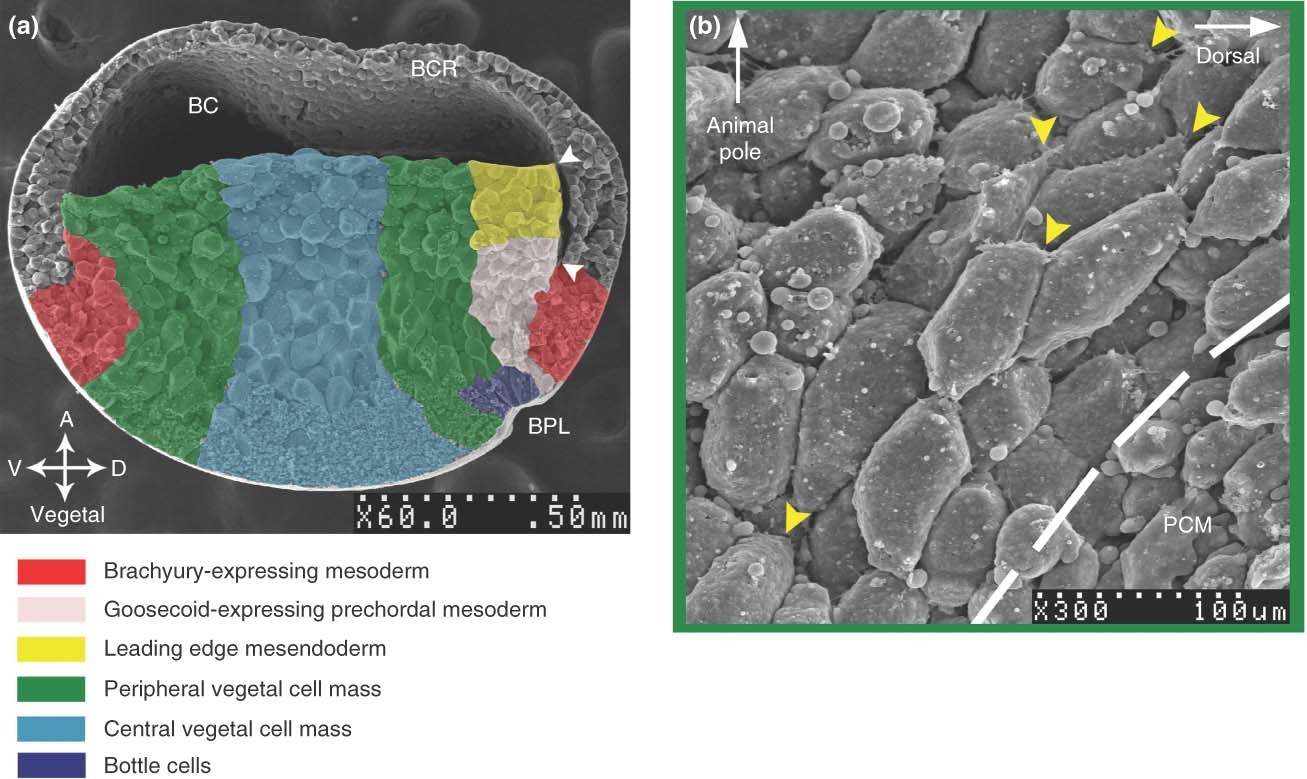 The movement of the prospective mesoderm and endoderm to the interior of the amphibian embryo starts in the vegetal cell mass well before the onset of overt gastrulation. By an animally directed movement of cells, the vegetal mass constricts its outer part and expands its inner region including the blastocoel floor, in a process of pregastrulation emboly. Further internalization of the vegetal region has been studied in the Xenopus embryo. At the onset of gastrulation, vegetal rotation sets in at the periphery of the vegetal cell mass, first dorsally and then spreading laterally and ventrally. It consists of an intense inward surging of cells due to active cell rearrangements that can be observed in explants of the vegetal cell mass. In its course, the blastocoel floor expands further and becomes apposed to the blastocoel roof. The boundary between apposed floor and roof forms Brachet's cleft. Another effect of vegetal rotation is the downward and inward movement of the mesodermal marginal zone, constituting the first phase of involution. Together, the upward and outward movement of the peripheral vegetal mass and the downward and inward translocation of the marginal zone lead to an apparent rotation of the whole peripheral region of the gastrula. Vegetal rotation continues to contribute to endoderm internalization to near the end of gastrulation.