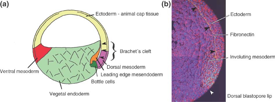 Figure 1. Brachet's cleft. (a) Schematic drawing of an early gastrula showing the formation of the morphologically visible Brachet's cleft when tissue separation of mesendoderm and ectoderm takes place. (b) Histological section of a Xenopus gastrula stained for fibronectin (yellow), C-cadherin-stained cellâcell borders (red), and 4â²,6-diamidino-2-phenylindole (DAPI)-stained nuclei (blue). Fibronectin marks the tissue border between mesendoderm and ectoderm. Black arrowheads mark Brachet's cleft. The white arrowhead marks the dorsal blastopore lip. Fibronectin staining and imaging were performed by C. Berger. (Reprinted with permission from Ref 7. Copyright 2004 Cold Spring Harbor)