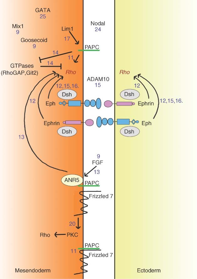 Figure 3. Molecular components involved in tissue separation during Brachet's cleft formation. Schematic summary of molecules involved in mesendodermal separation behavior and ectodermal repulsion behavior. Blue numbers refer to publications cited in this article.
