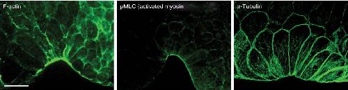 F-actin and activated Myosin (pMLC) are enriched apically in bottle cells, whereas microtubules (α-tubulin) are arranged in apicobasal arrays. Midsagittal confocal images; embryos are oriented apical down and animal to the right. Scale bar = 50 µm. (Reprinted with permisson from Ref 3. Copyright 2007 Elsevier)