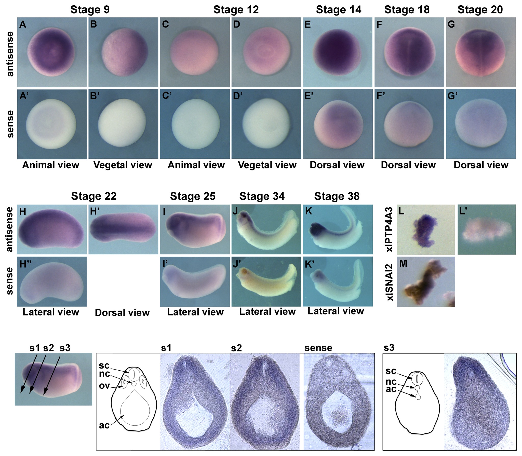 A-K) Whole-mount in situ hybridization showing the spatial expression of xlPTP4A3 during early Xenopus development. A'-K') Corresponding negative control using a sense probe of xlPTP4A3 mRNA. L) Whole-mount in situ hybridization of xlPTP4A3 in NC explants dissected at stage 17. L') Corresponding negative control using a sense probe of xlPTP4A3 mRNA. M) Whole-mount in situ hybridization of the NC marker xlSNAI2 on stage 17-dissected NC explants. s1-s3) Transverse sections through a stage 25 embryo stained by whole-mount in situ hybridization for xlPTP4A3 mRNA. Sense) Corresponding negative control using an xlPTP4A3 mRNA sense probe. sc: spinal cord, nc: notochord, ov: otic vesicle, ac: archenteron.